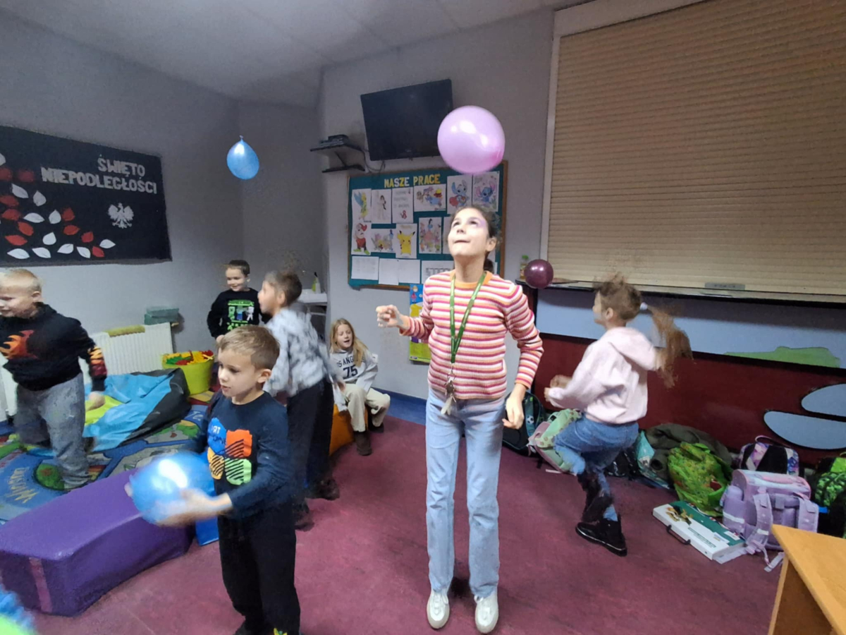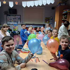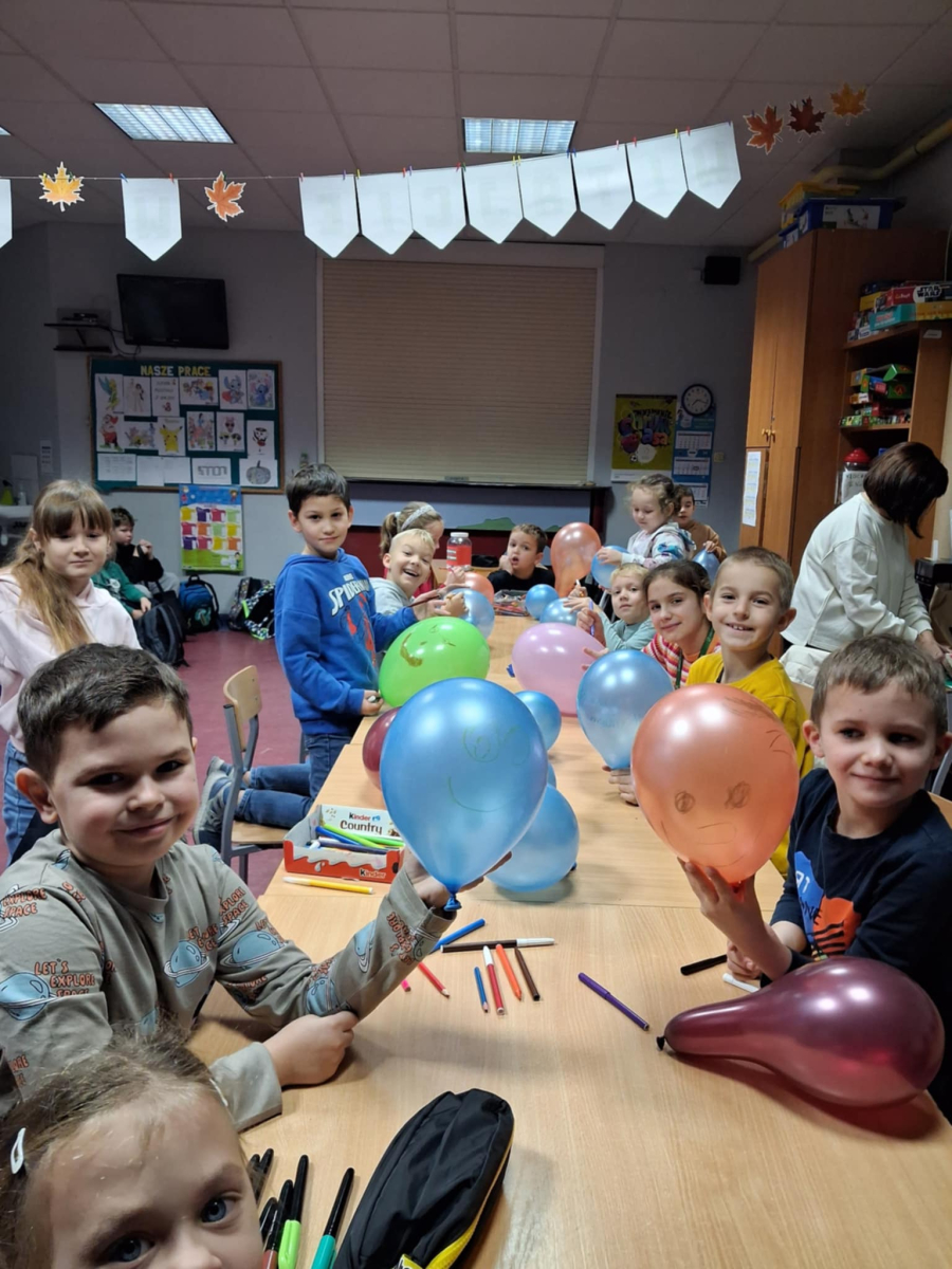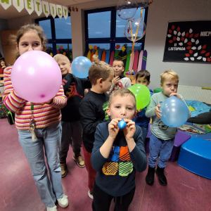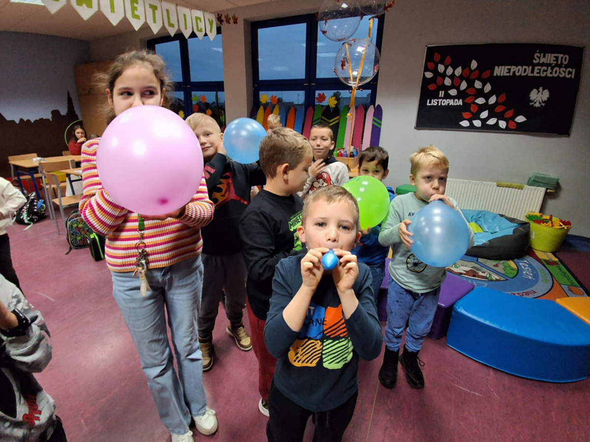 Wychowawcy dużej świetlicy szkolnej zorganizowali Dzień Balonów. W takcie zajęć dzieci samodzielnie dmuchały balony, były zabawy z balonami przy użyciu chusty animacyjnej. Celem zajęć była integracja dzieci w świetlicy.