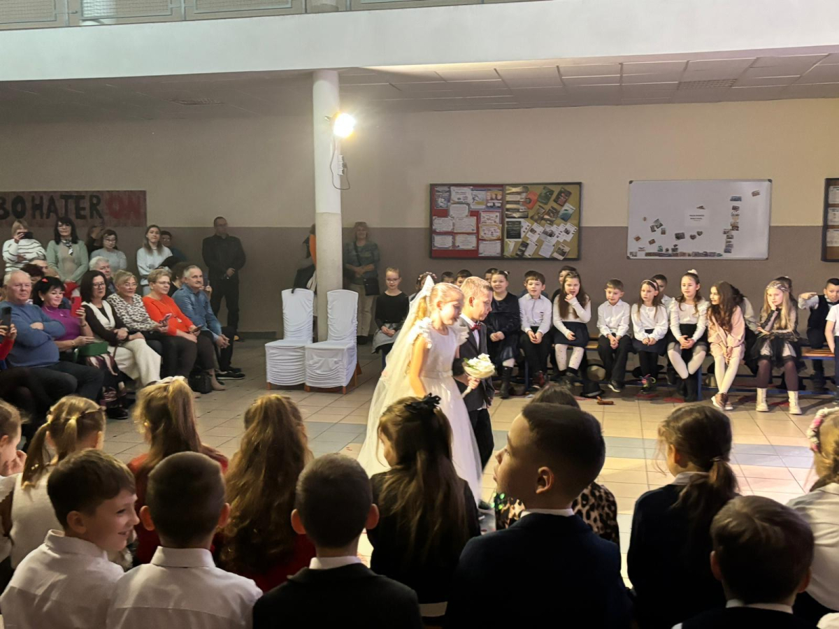 Drugoklasiści zaprezentowali piękny występ artystyczny opowiadający historię życia dziadków – od czasów ich dzieciństwa, przez moment poznania się, ślub, aż po narodziny dzieci i wnuków. Każdy etap tej opowieści został ubarwiony piosenkami, które wprowadzały publiczność w kolejne okresy życia bohaterów przedstawienia.