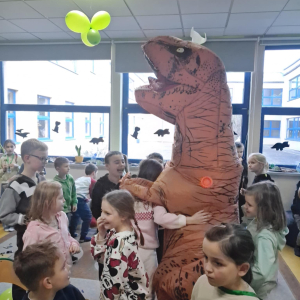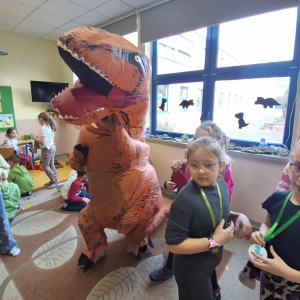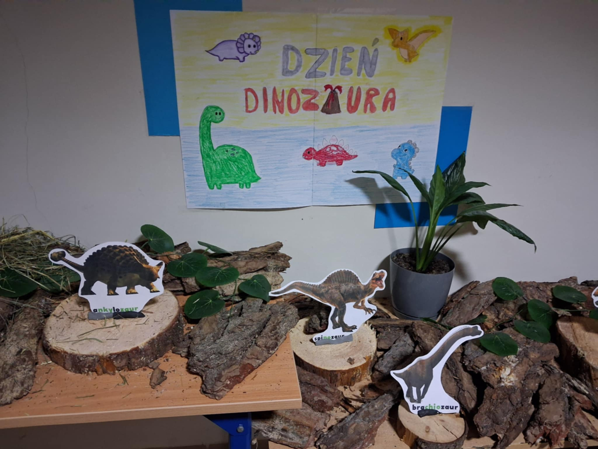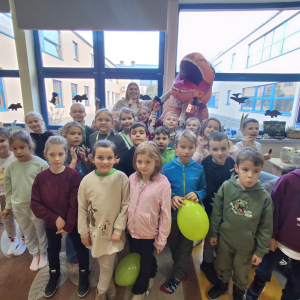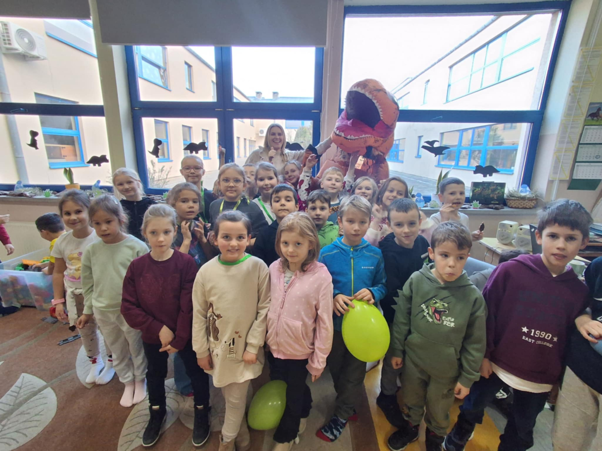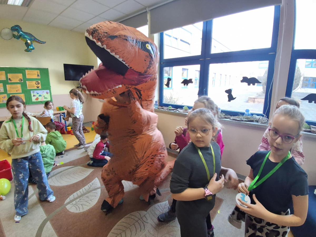 W świetlicy szkolnej obchodzony był Dzień Dinozaura. Dzieci uczestniczyły w ciekawych zajęciach, podczas których mogły zobaczyć eksperymenty chemiczne, w tym wybuch wulkanu, oraz poznać wiele interesujących ciekawostek o dinozaurach. Dużą atrakcją było także spotkanie „na żywo” z Tyranozaurem. W przygotowanie wydarzenia zaangażowali się uczniowie klas 4–8, którzy przygotowali poczęstunek dla młodszych koleżanek i kolegów oraz wykonali plakaty przedstawiające dinozaury. Serdeczne podziękowania kierujemy również do chłopców z klasy VII C, którzy zrobili młodszym uczniom miłą niespodziankę – odwiedzili ich podczas zajęć i wręczyli im medale z okazji Dnia Dinozaura.