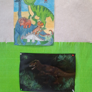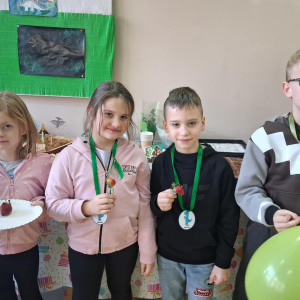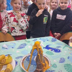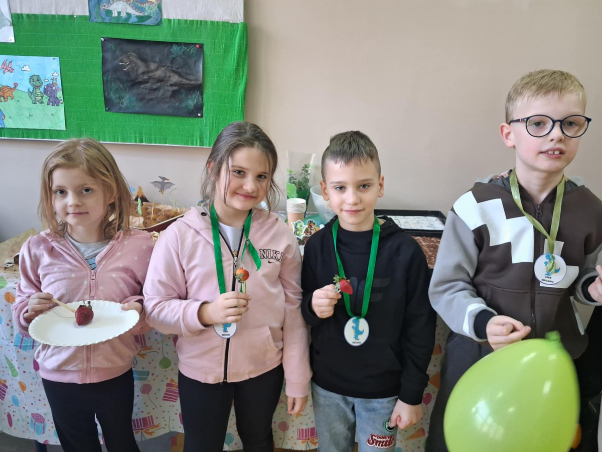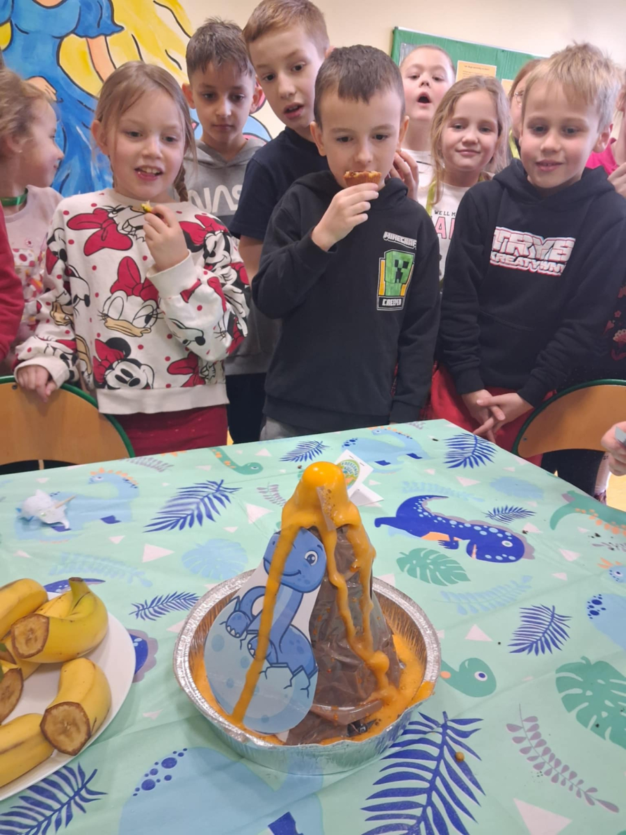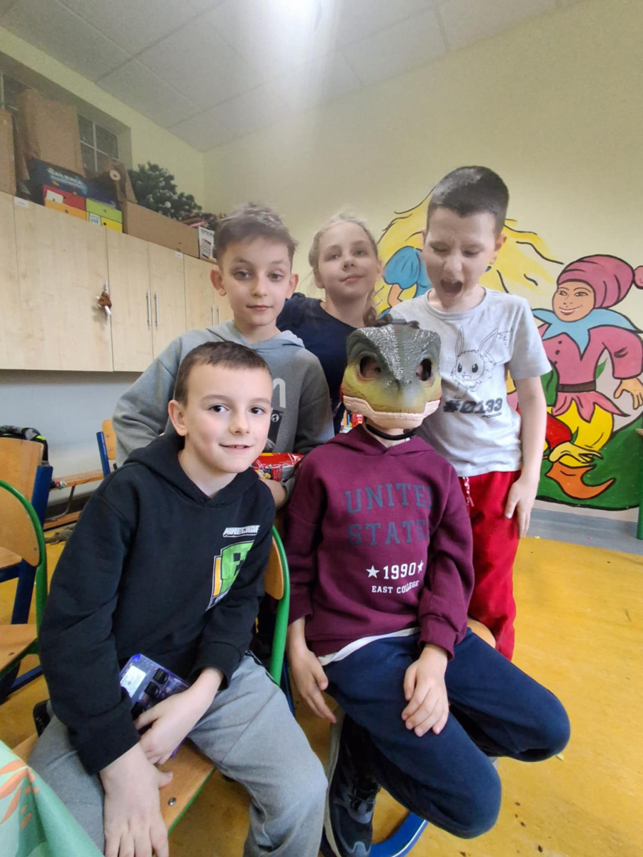 W świetlicy szkolnej obchodzony był Dzień Dinozaura. Dzieci uczestniczyły w ciekawych zajęciach, podczas których mogły zobaczyć eksperymenty chemiczne, w tym wybuch wulkanu, oraz poznać wiele interesujących ciekawostek o dinozaurach. Dużą atrakcją było także spotkanie „na żywo” z Tyranozaurem. W przygotowanie wydarzenia zaangażowali się uczniowie klas 4–8, którzy przygotowali poczęstunek dla młodszych koleżanek i kolegów oraz wykonali plakaty przedstawiające dinozaury. Serdeczne podziękowania kierujemy również do chłopców z klasy VII C, którzy zrobili młodszym uczniom miłą niespodziankę – odwiedzili ich podczas zajęć i wręczyli im medale z okazji Dnia Dinozaura.