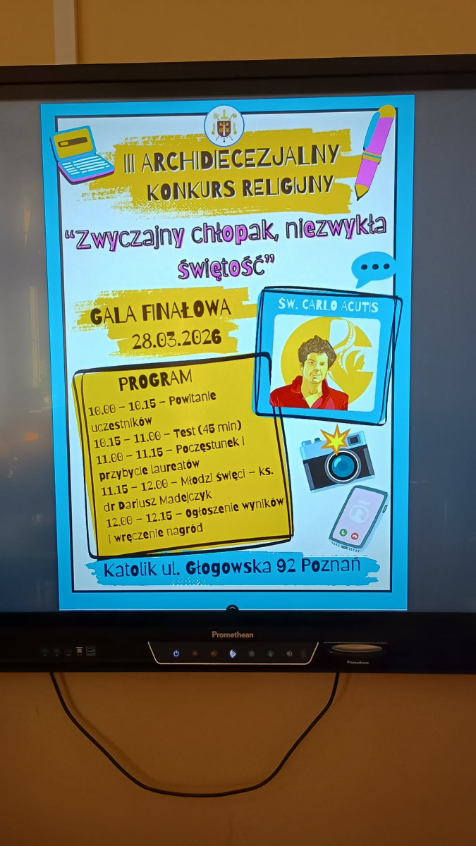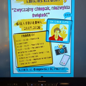 W sobotę 28 marca, w Poznaniu odbył się finał III Archidiecezjalnego Konkursu Religijnego ,,Zwyczajny chłopak, niezwykła świętość – Św. Carlo Acutis". W konkursie wzięli udział nasi dwaj uczniowie z klasy 7d.