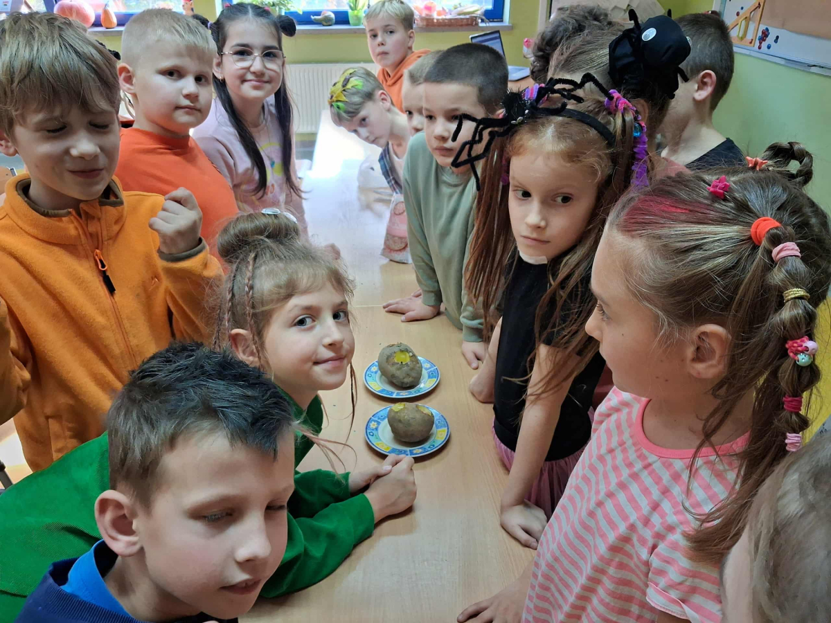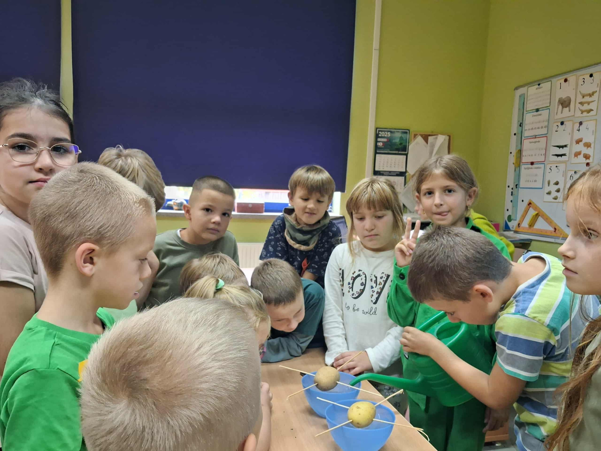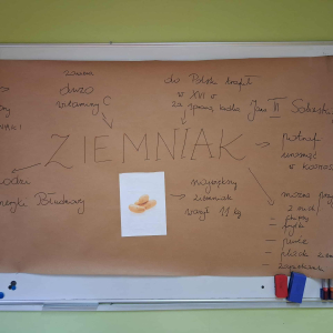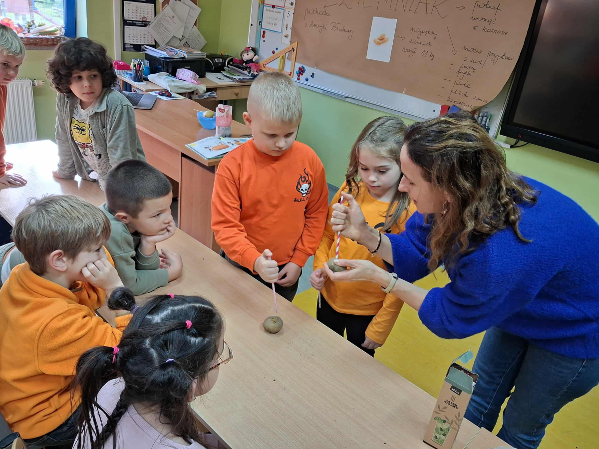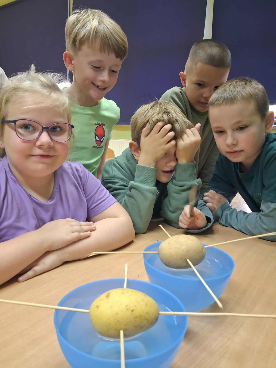 W ostatnich tygodniach tematem przewodnim innowacji pedagogicznej był "ziemniak". Uczniowie zdobyli cenną wiedzę na temat tego warzywa. Dzieci przede wszystkim uczestniczyły w doświadczeniach, których celem było zaobserwowanie różnego rodzaju zjawisk przyrodniczych, fizycznych oraz chemicznych. Wspólnie z uczniami posadzono ziemniaki w doniczce. Dzieci także brały udział w różnorodnych doświadczeniach, podczas których mogły: wydrążyć "studnię" w ziemniaku, odkryć tajemnicę skrobi, przebić ziemniaka papierową słomką, "nauczyć ziemniaka pływać" oraz "wykiełkować ziemniaka". Eksperymenty "cieszyły się" dużym zainteresowaniem wśród uczniów. C.d.n.