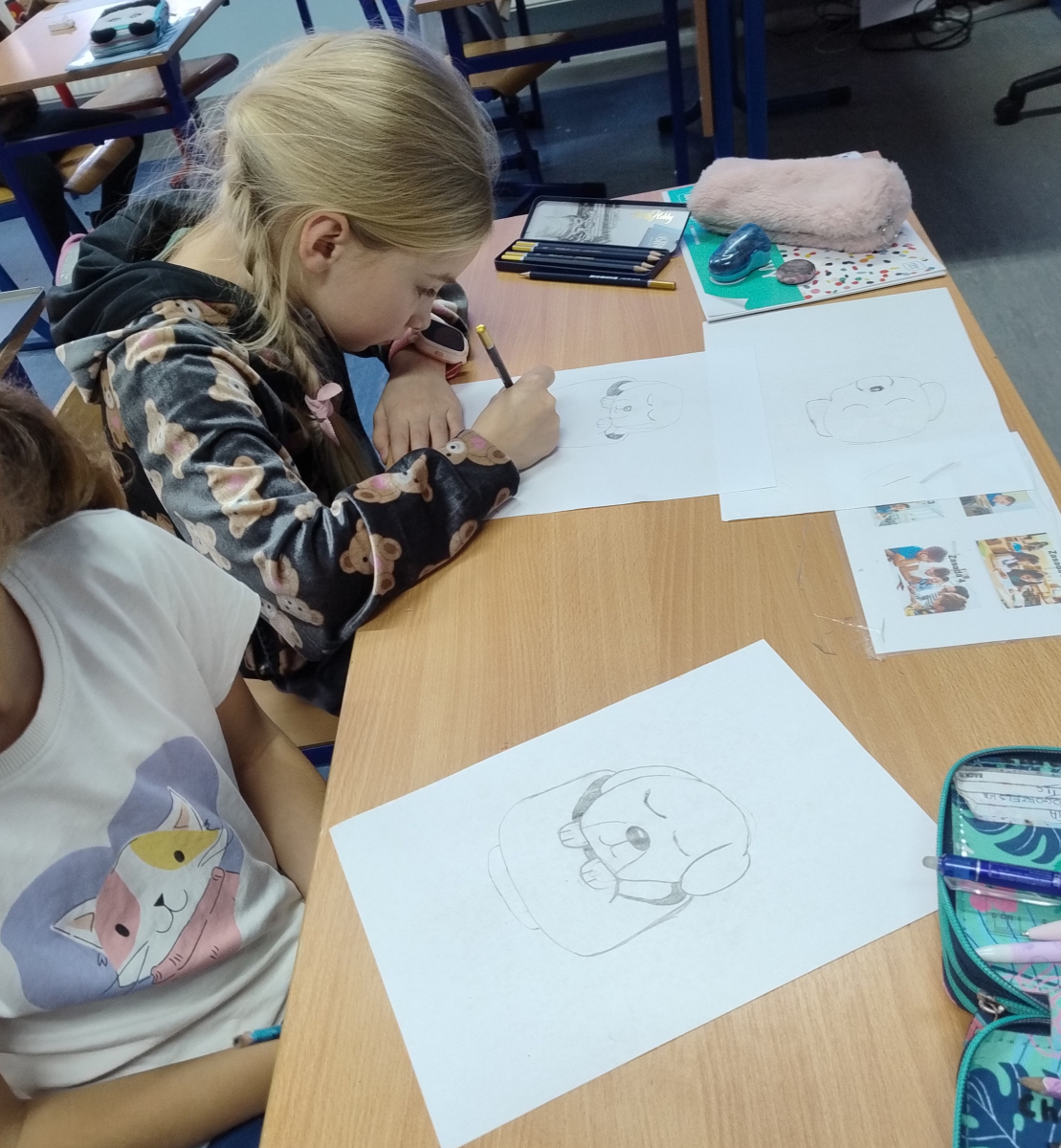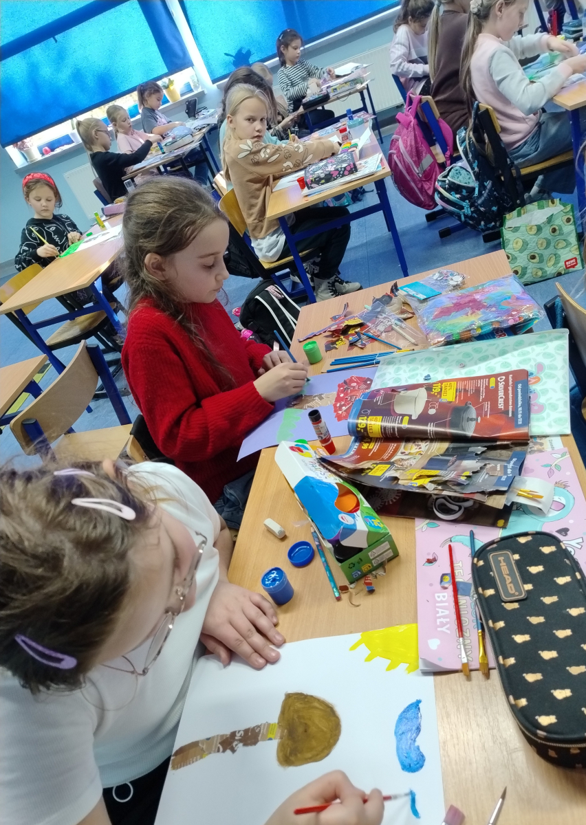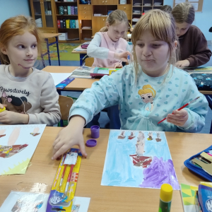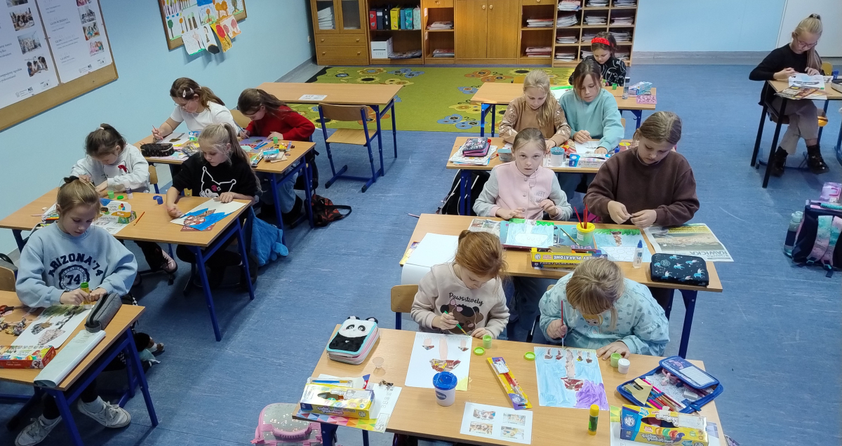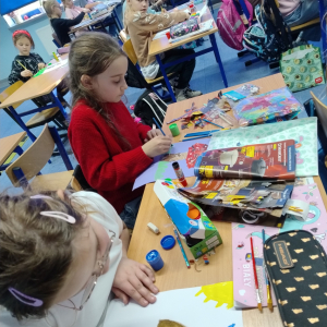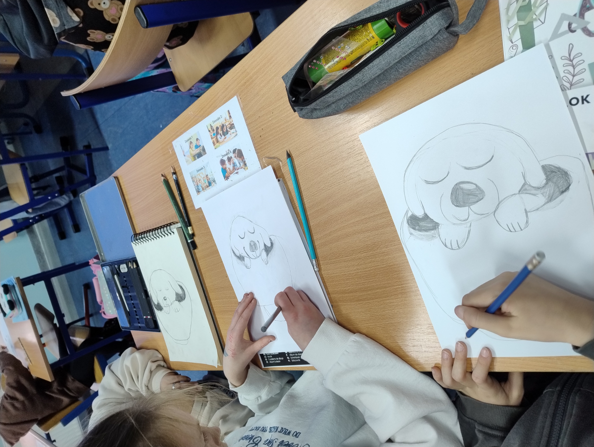 Uczniowie z radością tworzą różnorodne prace plastyczne – malują, wykonują kolaże, poznają podstawy rysunku oraz uczą się wyrażać emocje poprzez sztukę. Każde zajęcia to przestrzeń do rozwijania kreatywności, radości tworzenia i odkrywania własnego potencjału artystycznego.