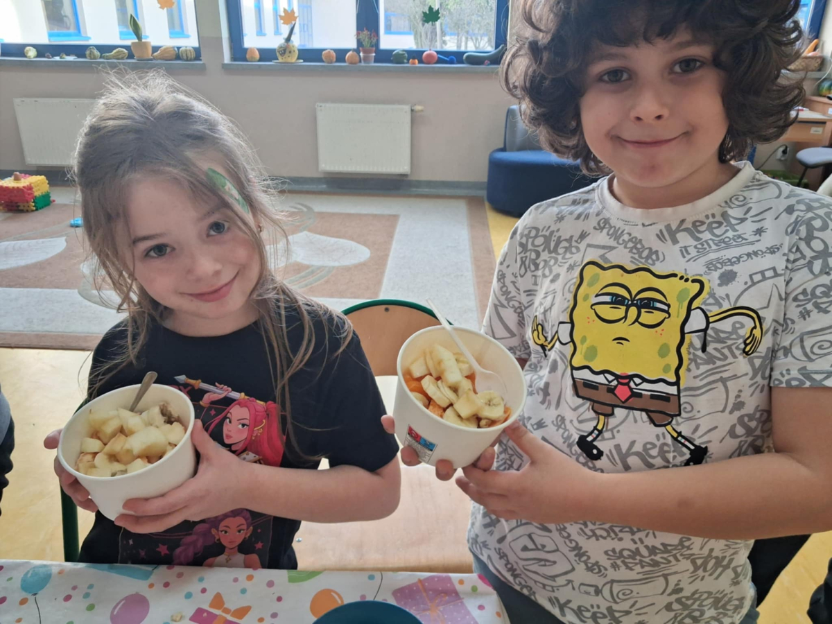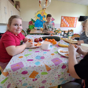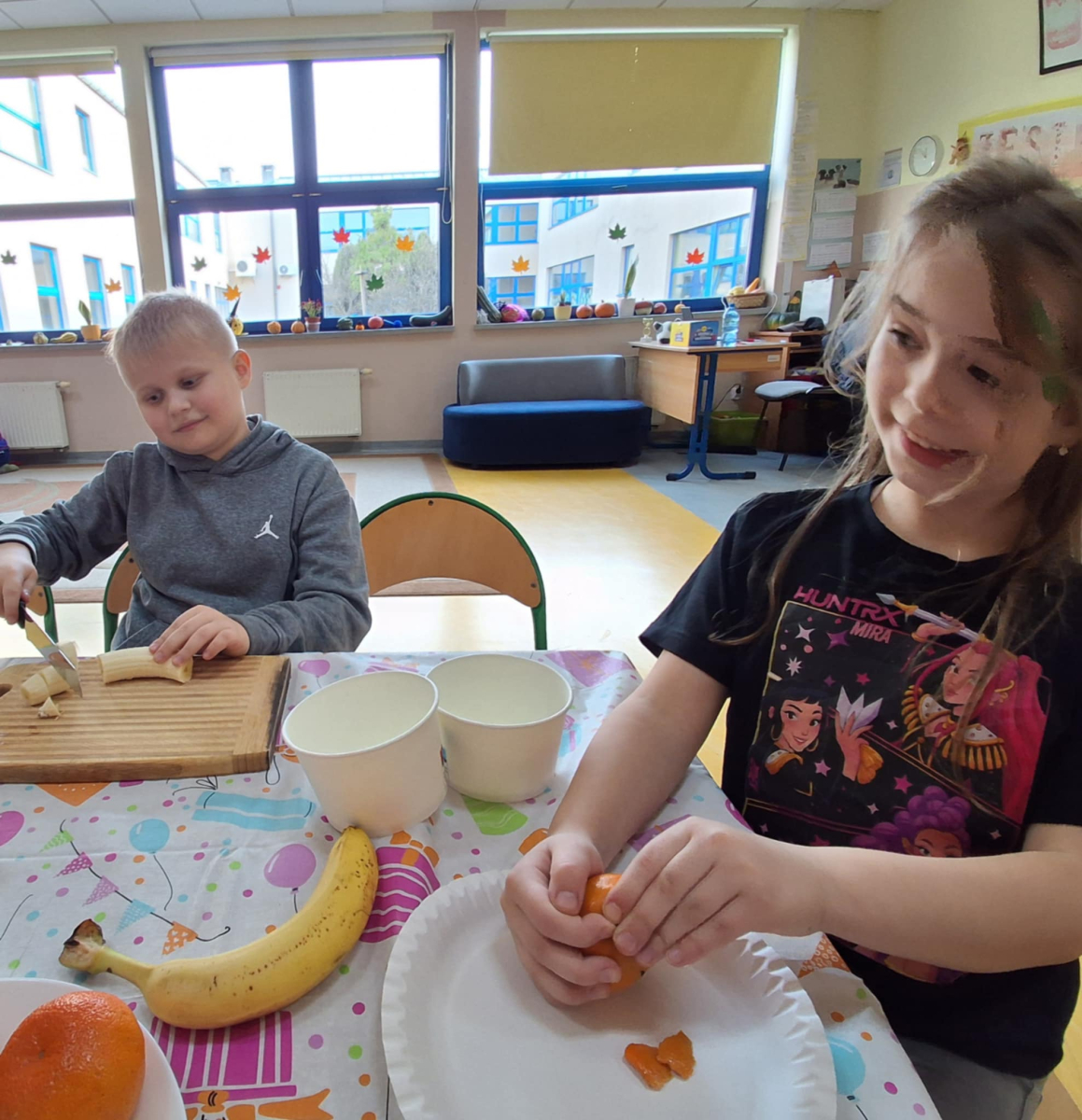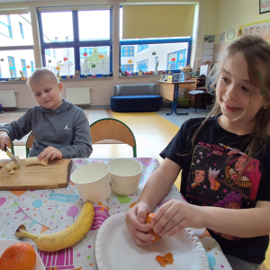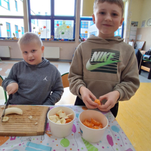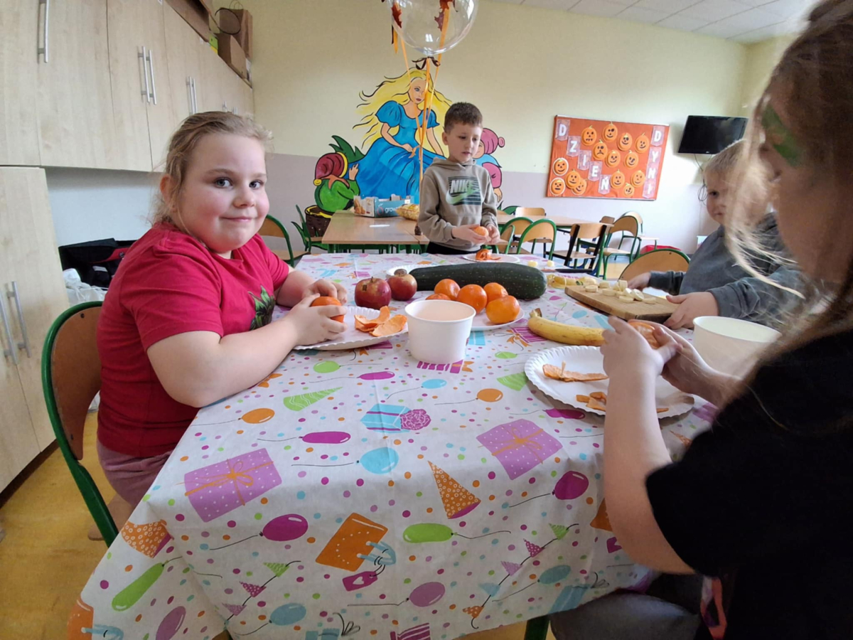 W świetlicy szkolnej zostały zorganizowane zajęcia pod hasłem „Zdrowe odżywianie”. Uczniowie podczas zajęć poznali wiele ciekawostek o owocach i warzywach oraz ich wartościach odżywczych. Dzieci samodzielnie przygotowały pyszną i kolorową sałatkę owocową, ucząc się przy tym, jak ważne jest spożywanie zdrowych produktów.