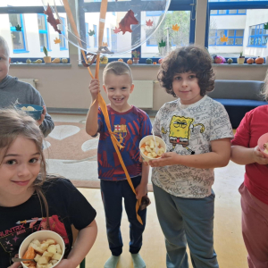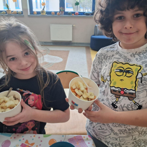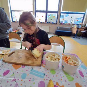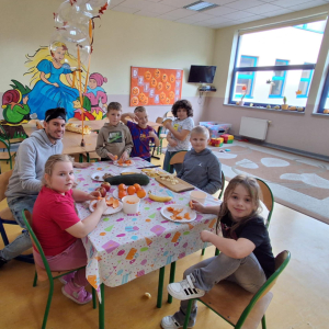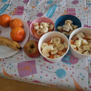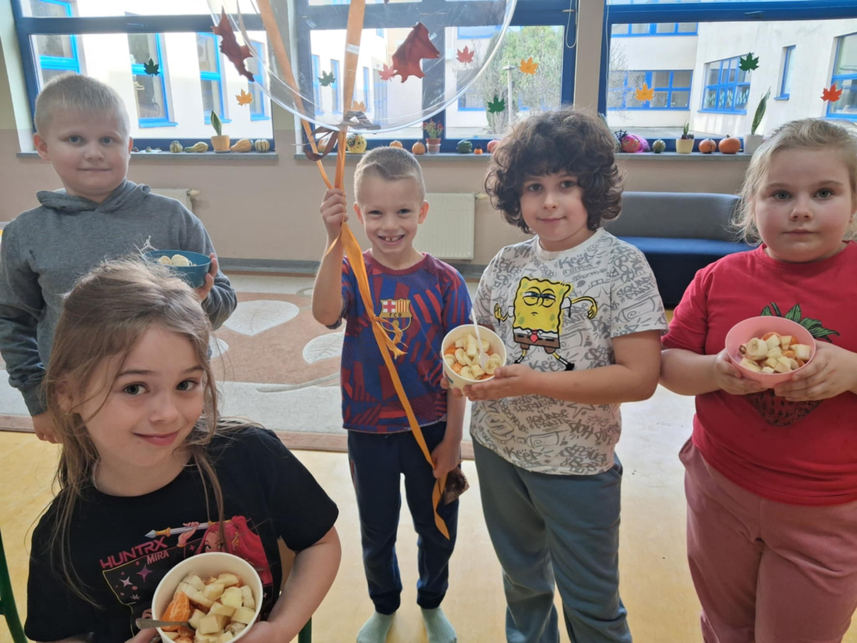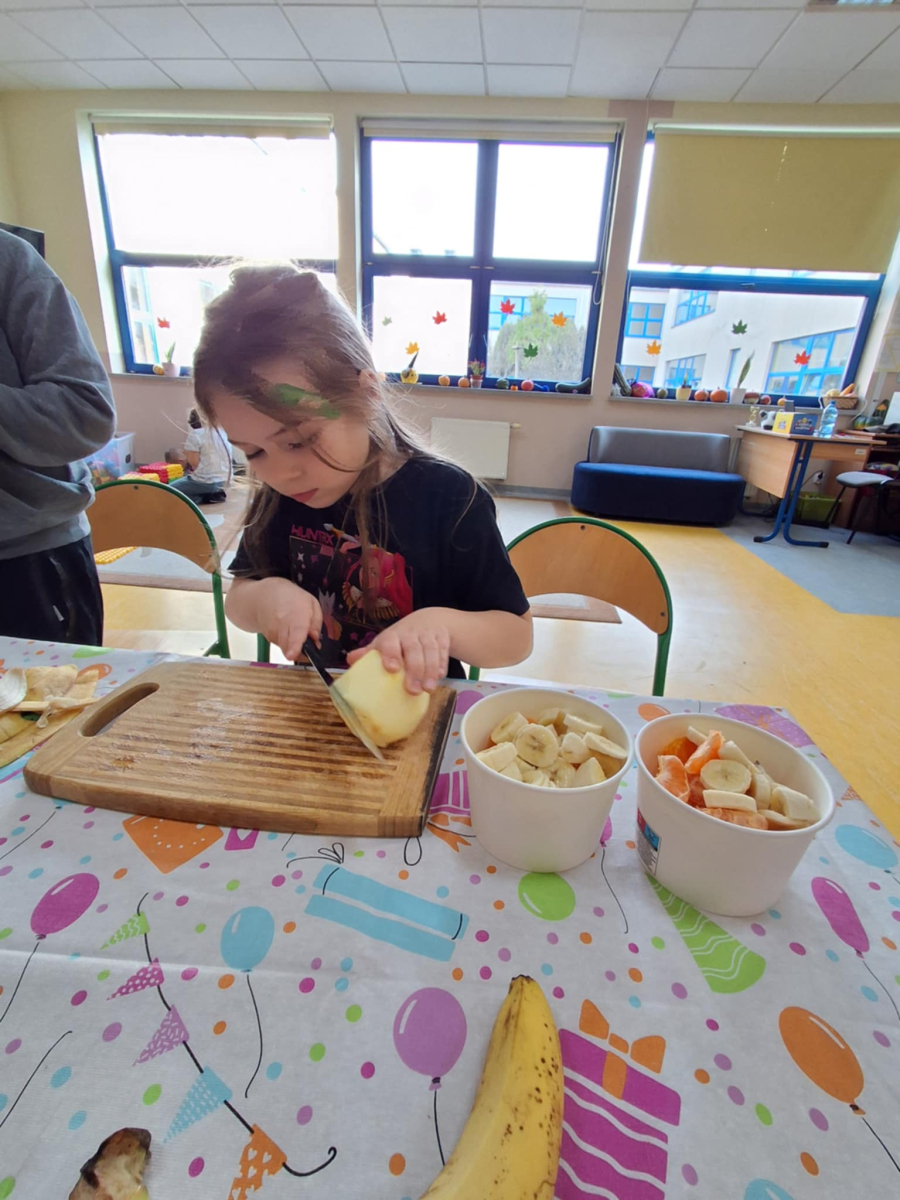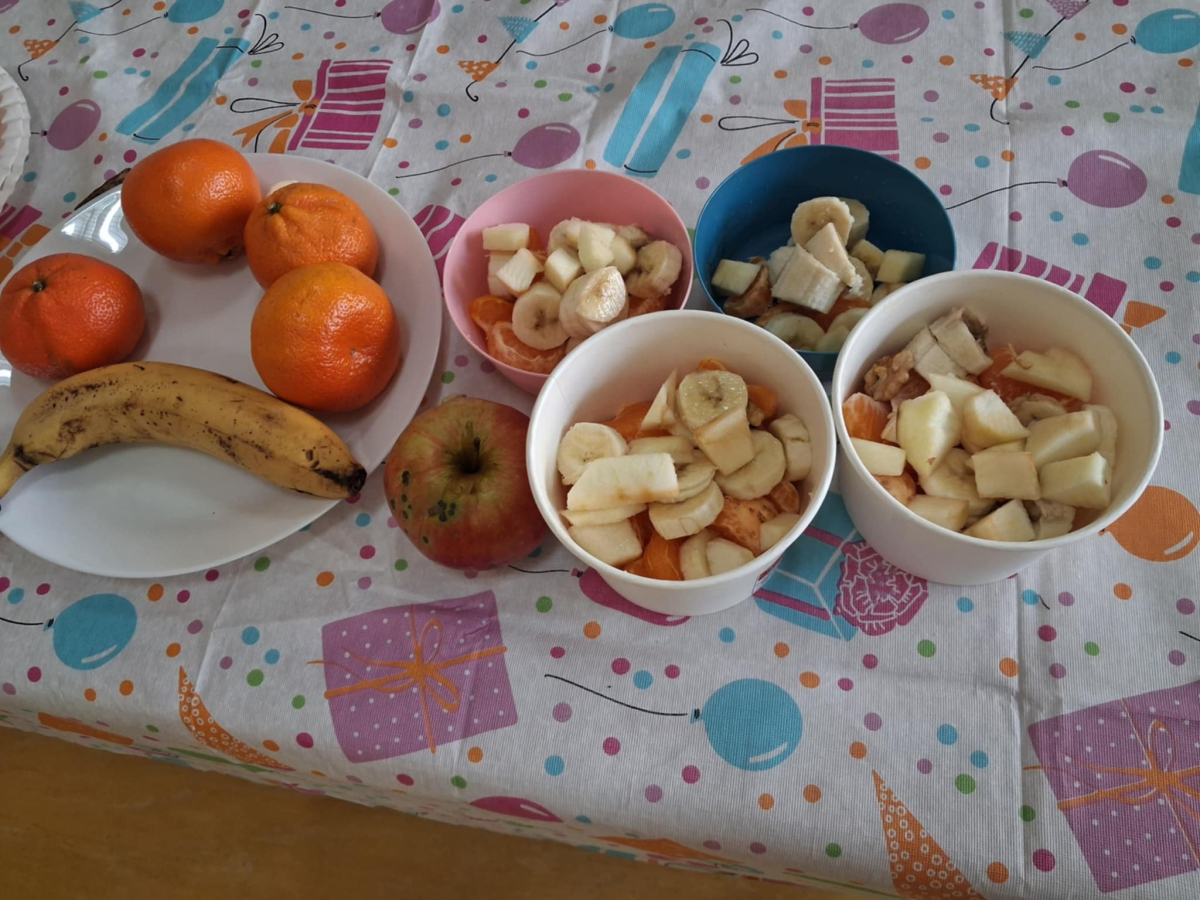 W świetlicy szkolnej zostały zorganizowane zajęcia pod hasłem „Zdrowe odżywianie”. Uczniowie podczas zajęć poznali wiele ciekawostek o owocach i warzywach oraz ich wartościach odżywczych. Dzieci samodzielnie przygotowały pyszną i kolorową sałatkę owocową, ucząc się przy tym, jak ważne jest spożywanie zdrowych produktów.