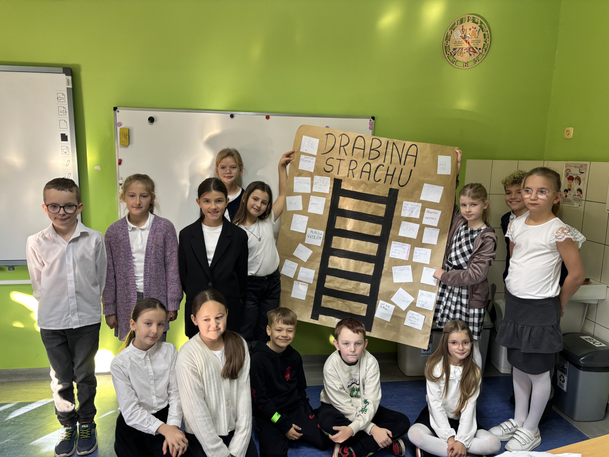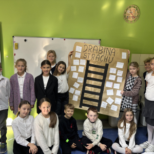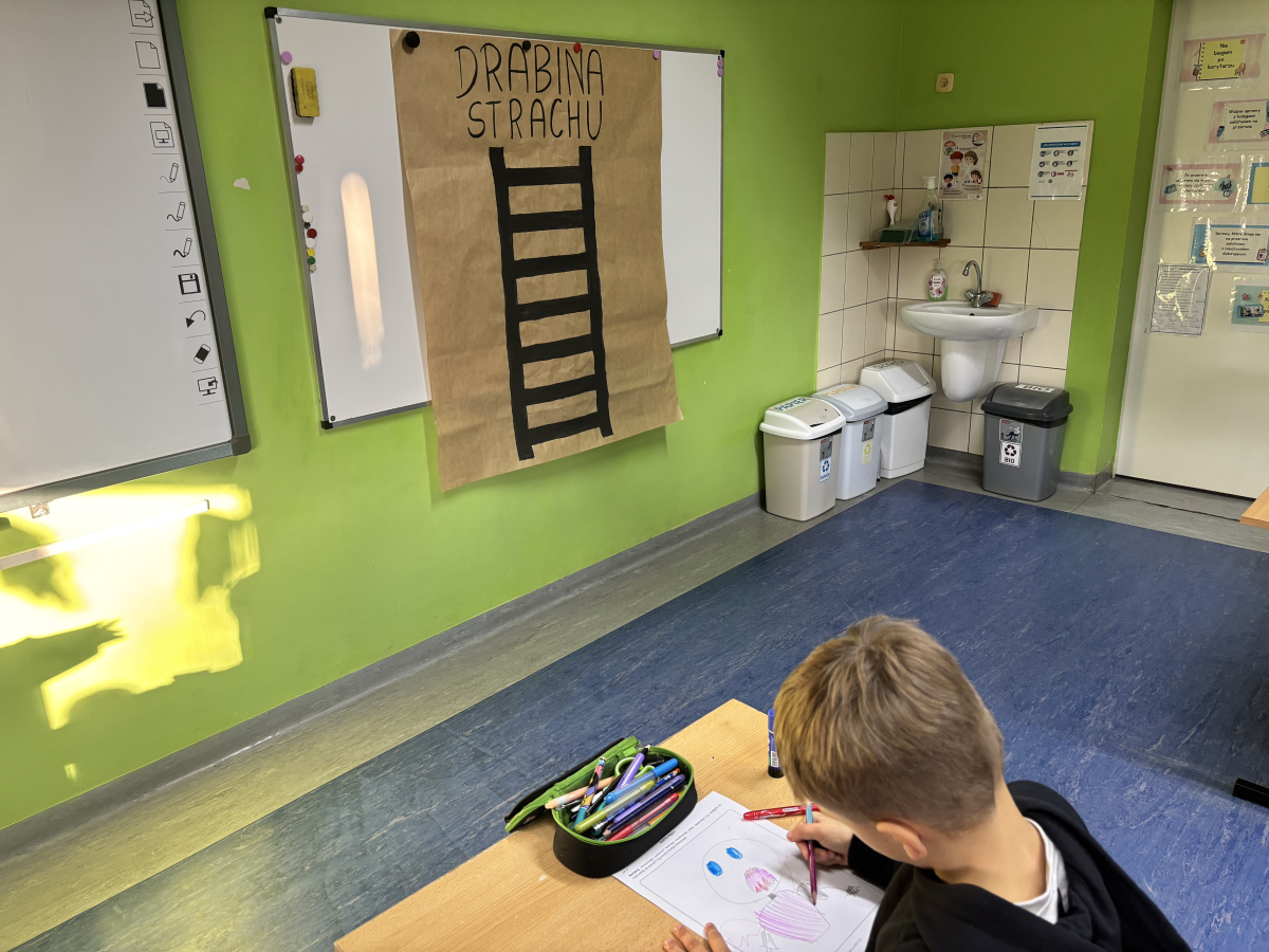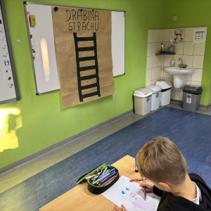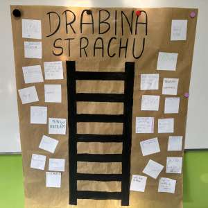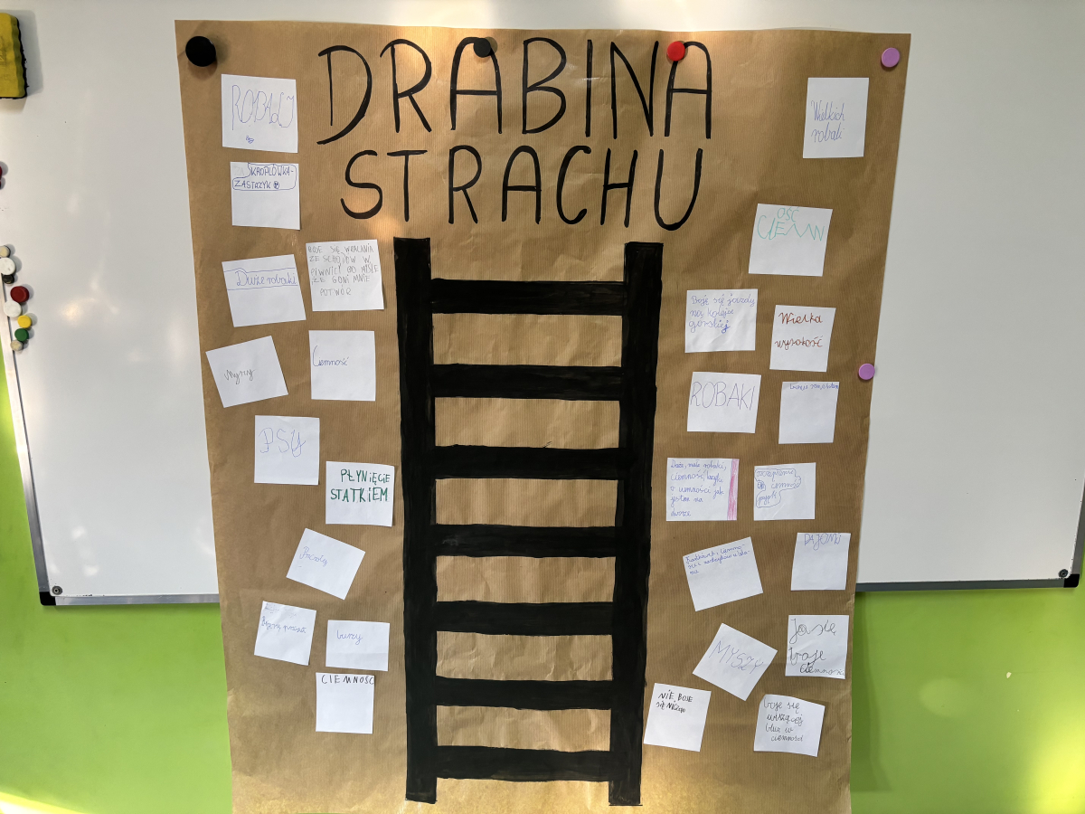 Uczniowie wykonali prace plastyczne przedstawiające strach oraz stworzyli drabinę strachu, na której zaznaczali, czego boją się mniej, a czego bardziej.
