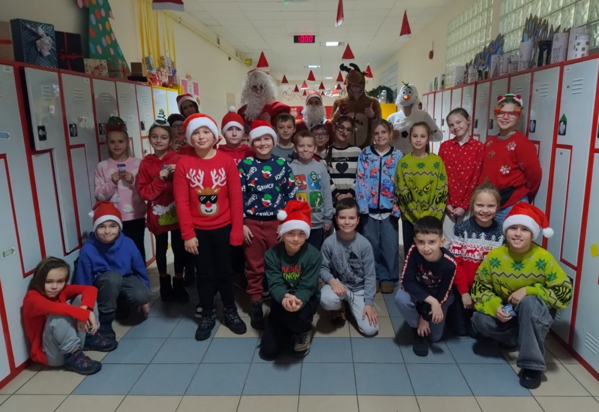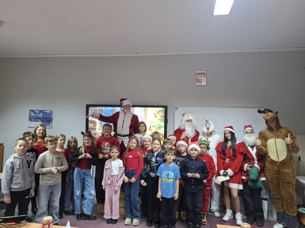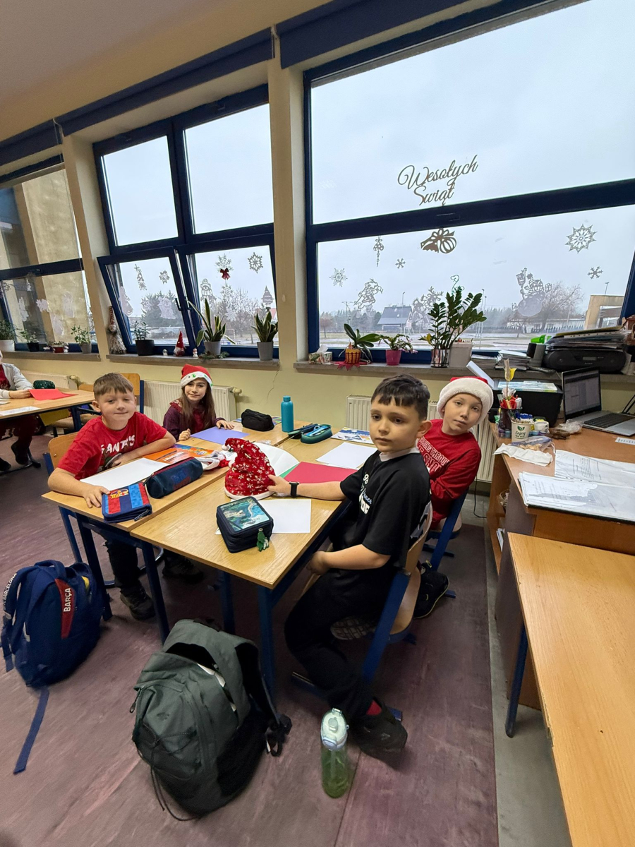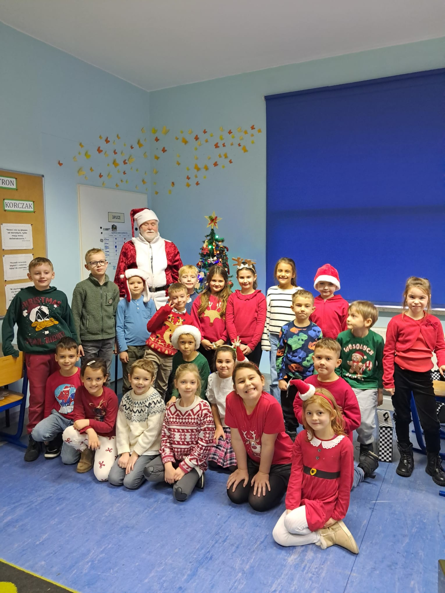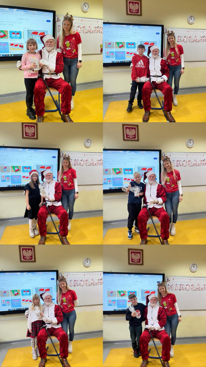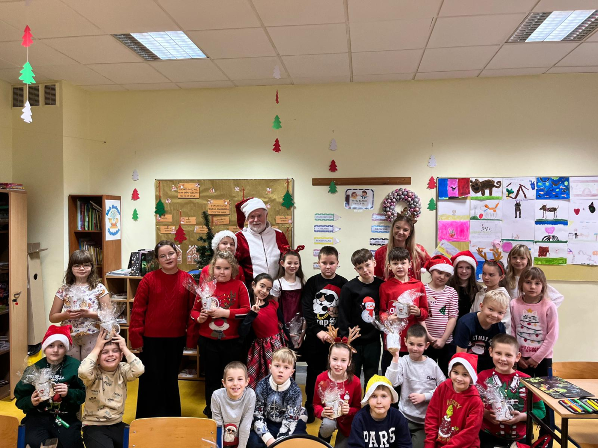 Największą niespodzianką była wizyta Świętego Mikołaja, który, rozmawiał z dziećmi i obdarował je upominkami. Uczniowie z ogromnym zaangażowaniem dekorowali także swoje sale lekcyjne, tworząc prawdziwie magiczną, zimową atmosferę.