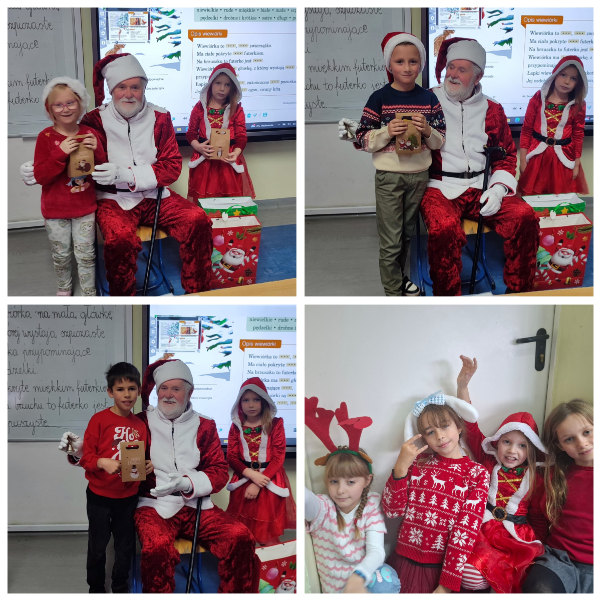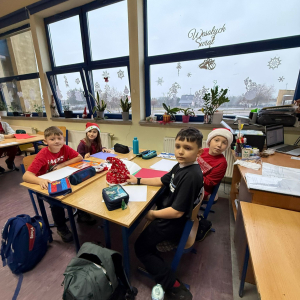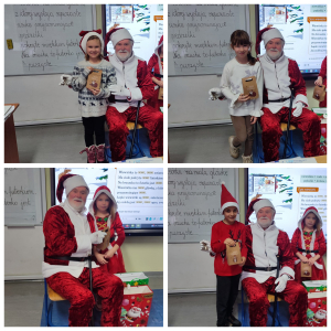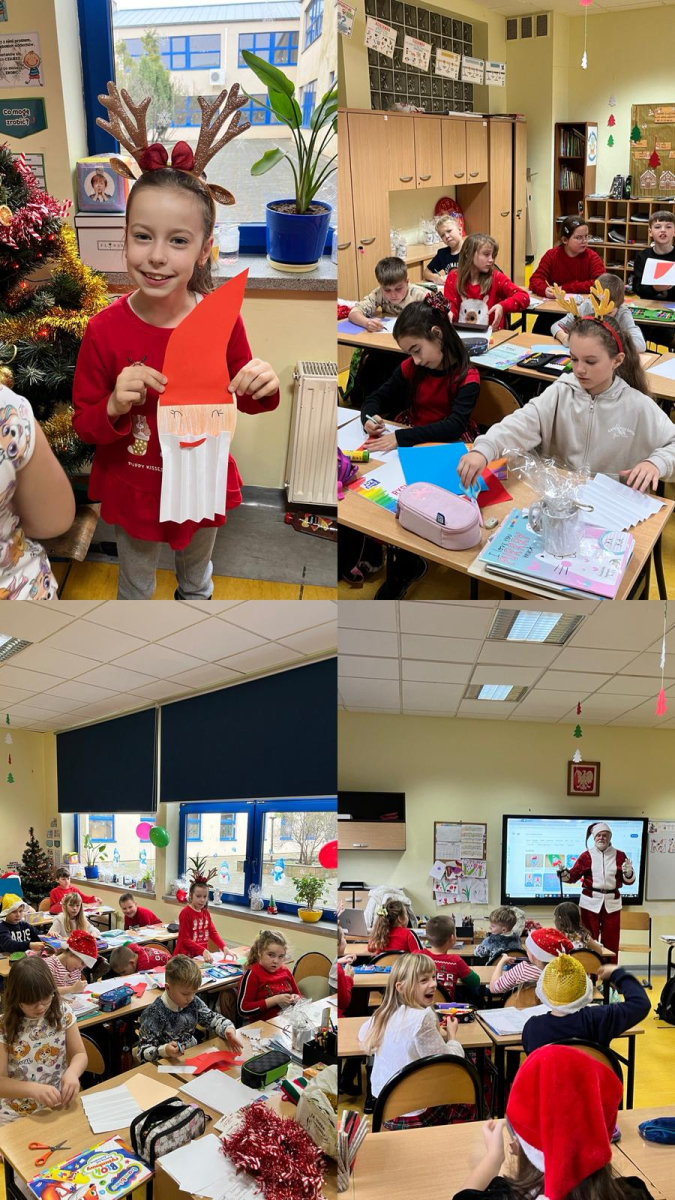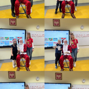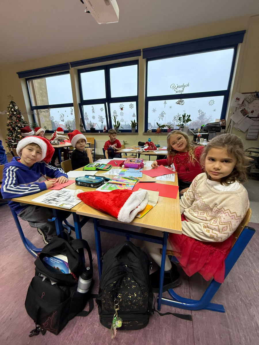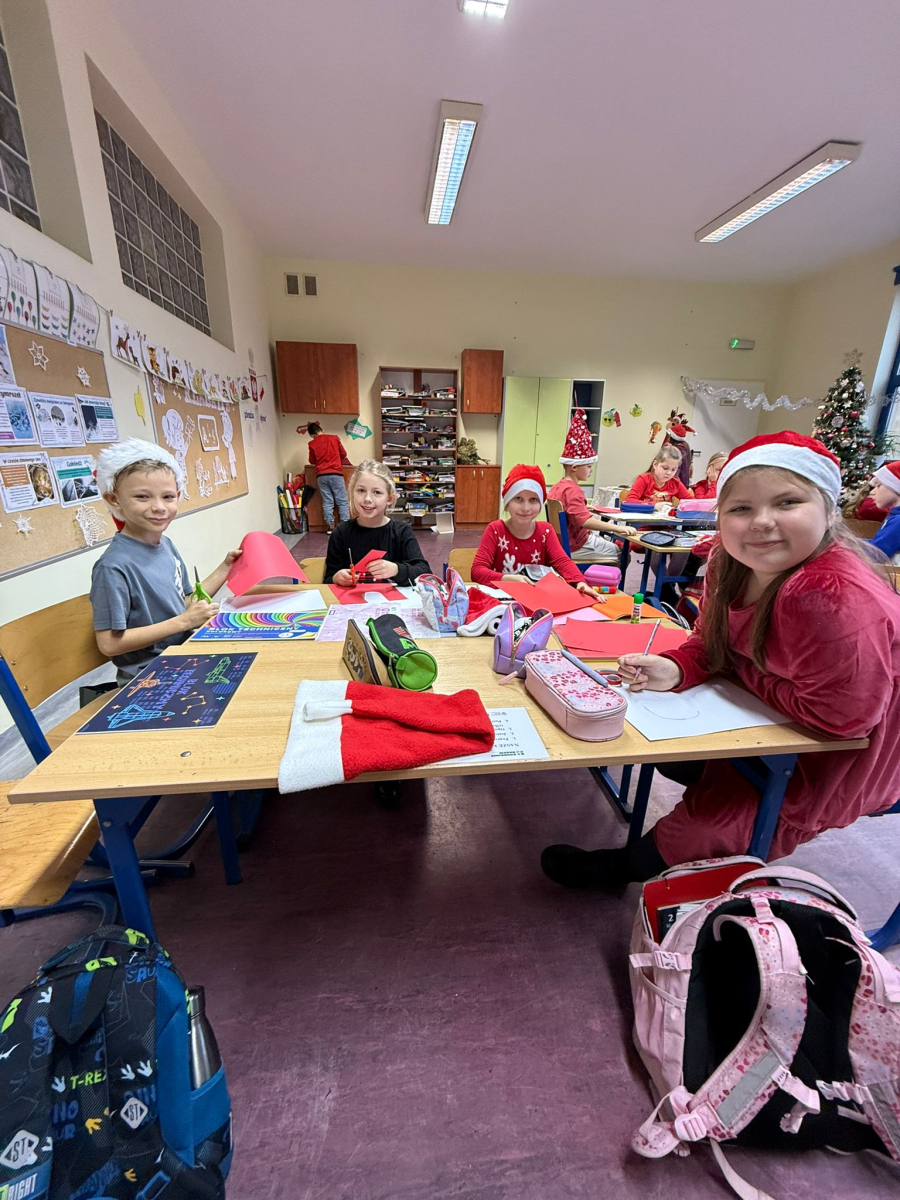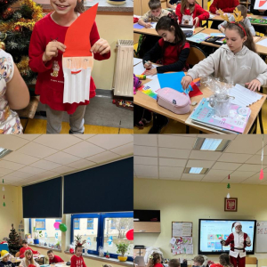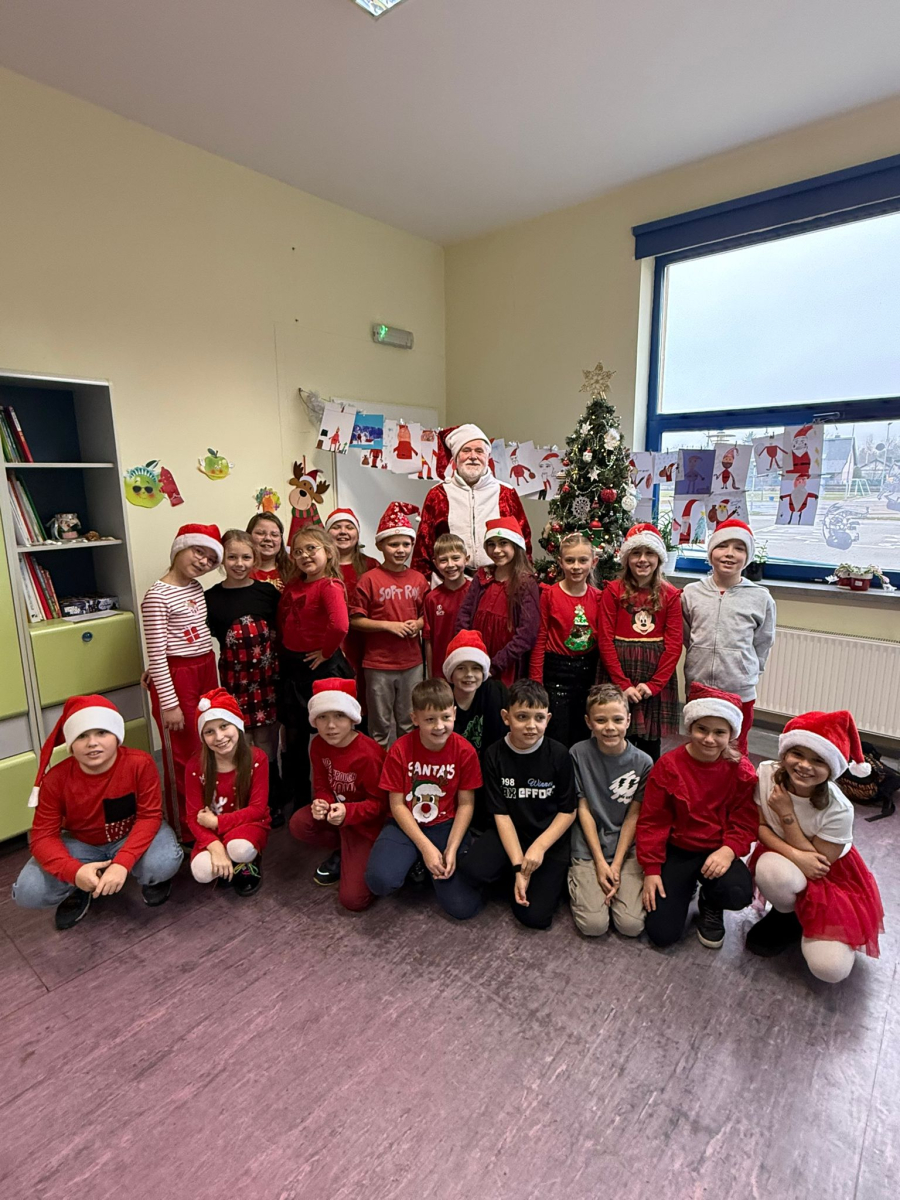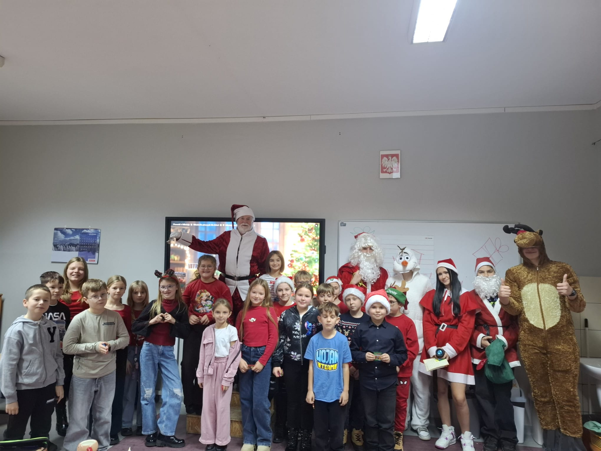 Największą niespodzianką była wizyta Świętego Mikołaja, który, rozmawiał z dziećmi i obdarował je upominkami. Uczniowie z ogromnym zaangażowaniem dekorowali także swoje sale lekcyjne, tworząc prawdziwie magiczną, zimową atmosferę.