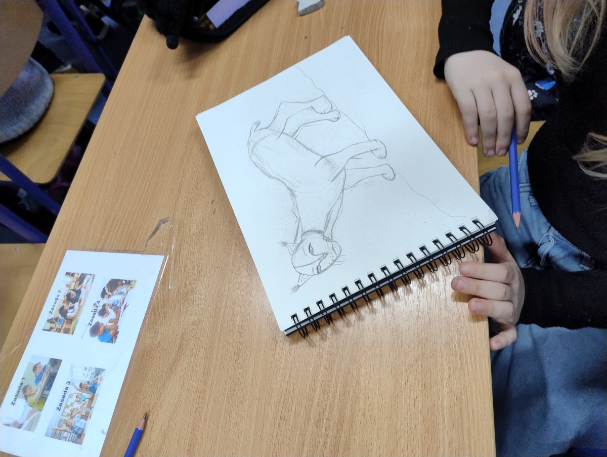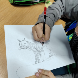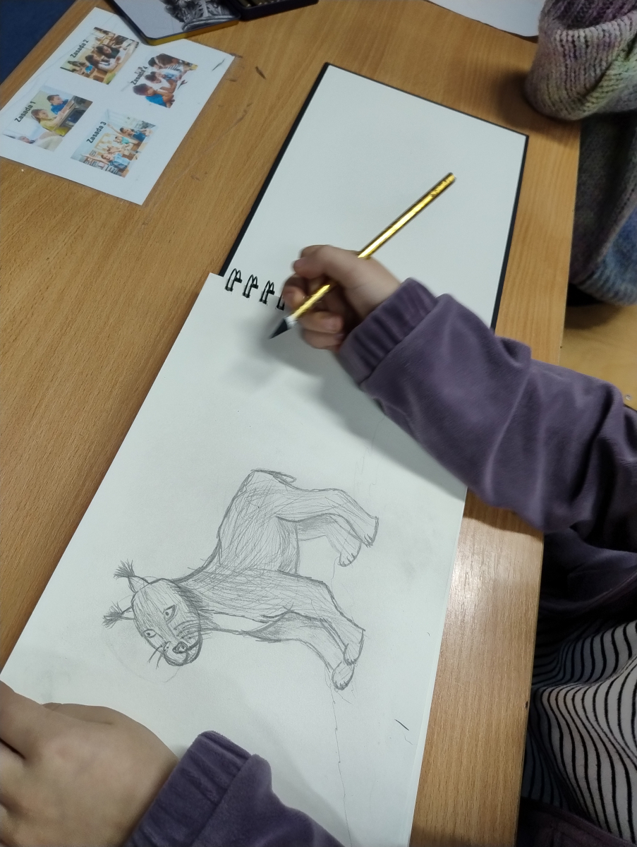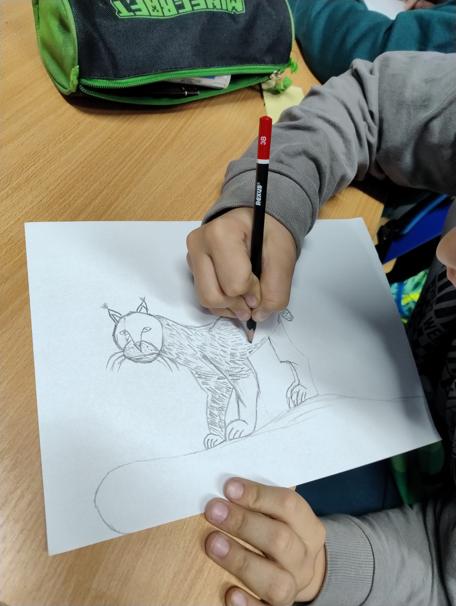 Podczas spotkań uczniowie m.in. pracowali nad studium sylwetki rysia. Skupili się na zachowaniu właściwych proporcji zwierzęcia oraz na budowaniu formy przy użyciu światłocienia. Uczestnicy uważnie analizowali charakterystyczne cechy wyglądu tego pięknego drapieżnika i starali się wiernie oddać je w swoich rysunkach. Pracowali bardzo uważnie, odkrywając, jak wiele detali i zależności kryje w sobie pozornie prosta budowa ciała.