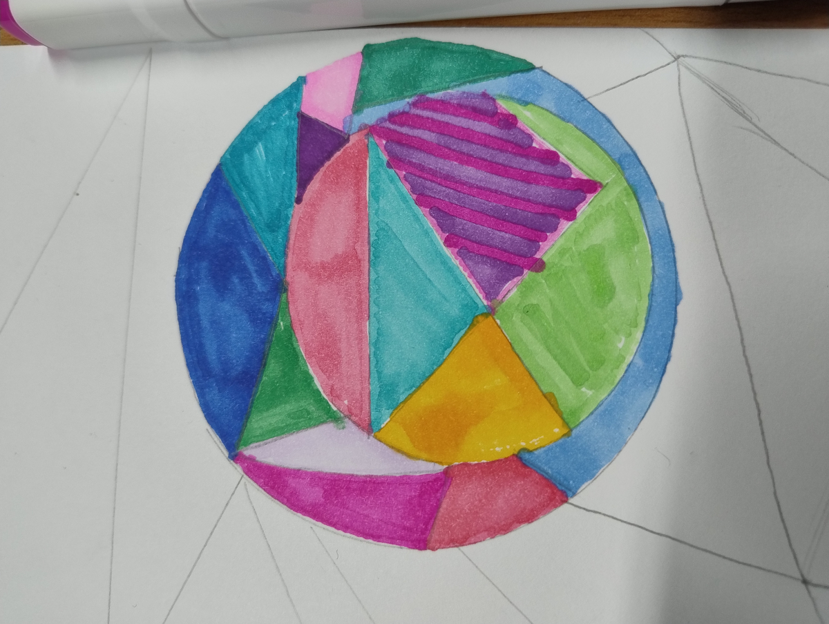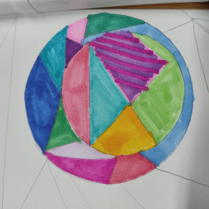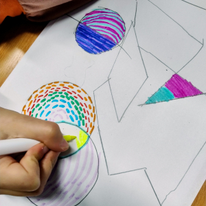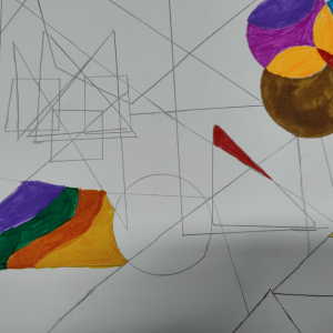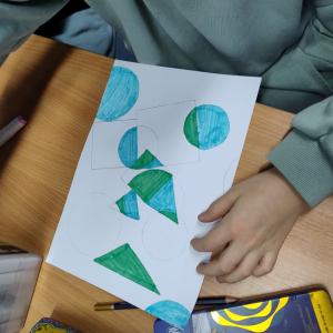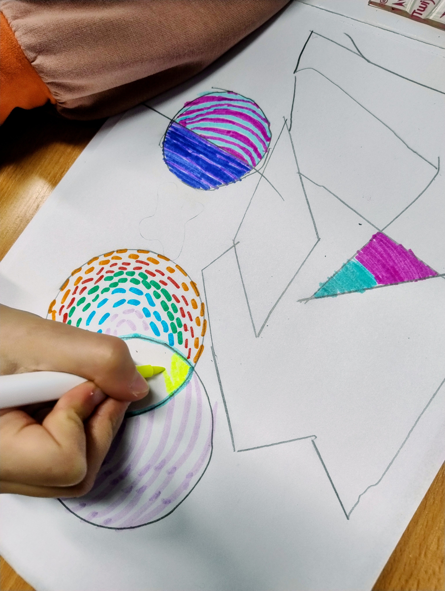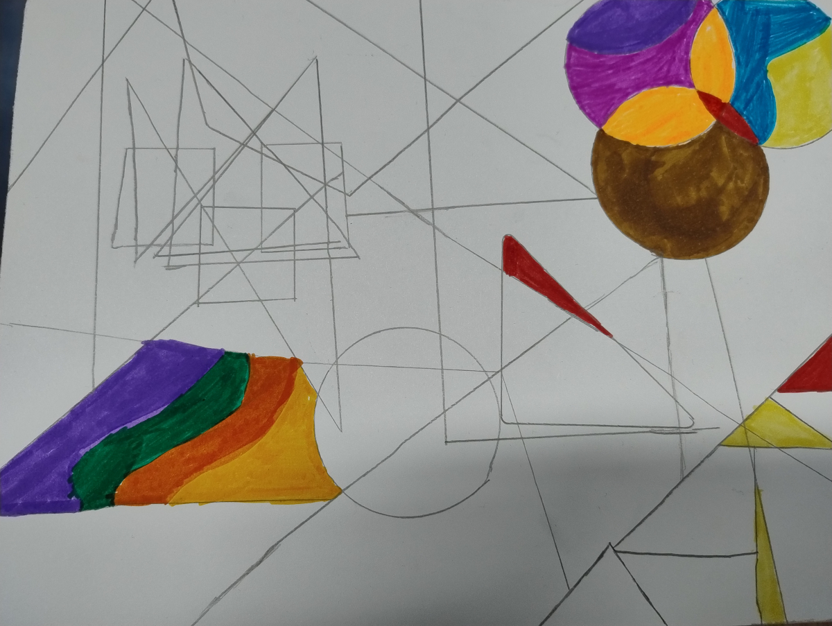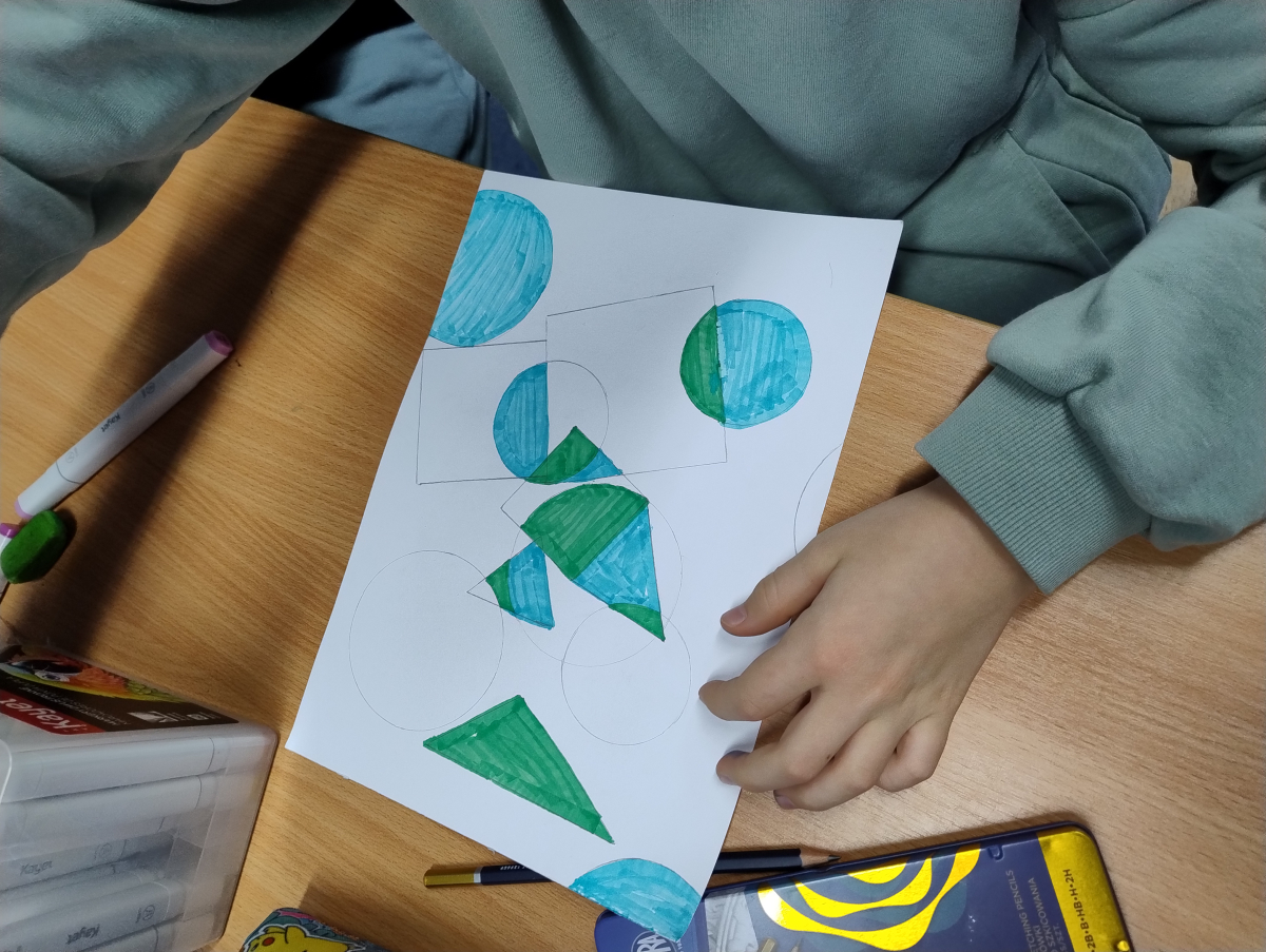 Podczas innego spotkania uczniowie poznali pojęcie abstrakcji geometrycznej. Po krótkim wprowadzeniu teoretycznym tworzyli własne kompozycje inspirowane tym kierunkiem — eksperymentując z formą, rytmem i układem kształtów.