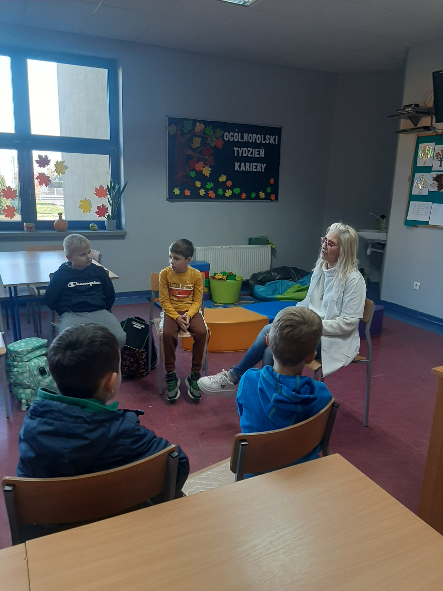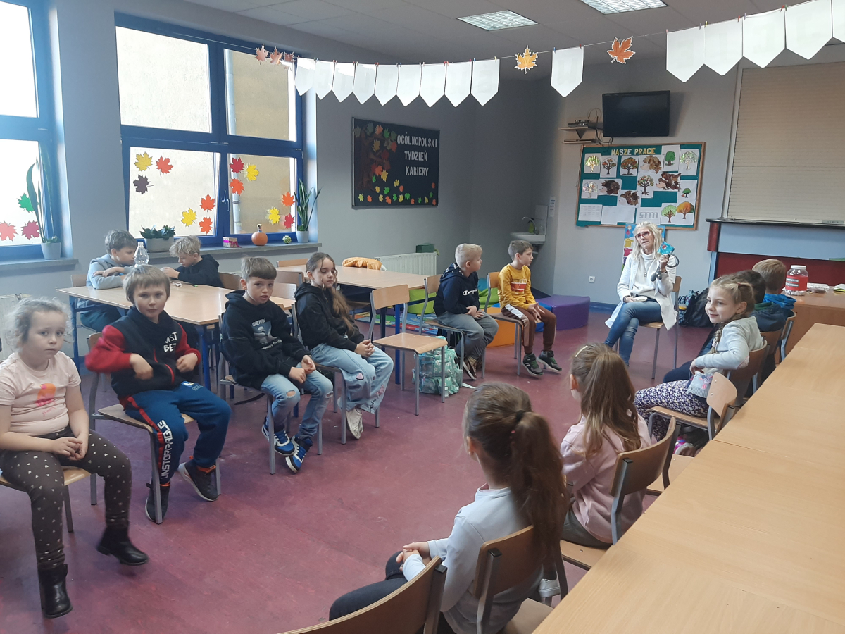 Tydzień od 20 do 24 października obfitował w różne wydarzenia o charakterze zawodoznawczym. W poniedziałek 20 października br. zainaugurowaliśmy Ogólnopolski Tydzień Kariery. Gościem w naszej szkole był Jakub Stankiewicz - prawnik specjalizujący się w prawie karnym, który wygłosił wykład pt. "Prawo - zasady gry w życie". Pan Jakub jest doktorantem na Wydziale Prawa i Administracji Uniwersytetu im. Adama Mickiewicza w Poznaniu, a ponadto orzeka w Sądzie Okręgowym w Poznaniu. Podczas spotkania uczniowie dowiedzieli się jak spełnić kryteria rekrutacyjne na studia prawnicze, jak wyglądają te studia oraz jakie są perspektywy zawodowe po ich ukończeniu. Prelegent podzielił się z uczniami doświadczeniem zawodowym i odpowiedział na nurtujące ich pytania. Uczniowie mieli możliwość uczestniczenia w spotkaniu z przedstawicielami Wojskowego Centrum Rekrutacji w Lesznie, którzy opowiedzieli o warunkach naboru i pracy w służbie wojskowej. W świetlicy szkolnej gościła nasza pielęgniarka - p. Ewa Andrzejewska, która opowiedziała dzieciom o swojej pracy, odważnym ochotnikom mierzyła ciśnienie i badała saturację. W ramach tygodnia kariery przeprowadzone zostały też indywidualne konsultacje z doradcą zawodowym - p. Moniką Lorenc - która pracuje w Poradni Psychologiczno-Pedagogicznej w Rawiczu. W spotkaniu z doradcą zawodowym uczestniczyli chętni uczniowie z klas ósmych.