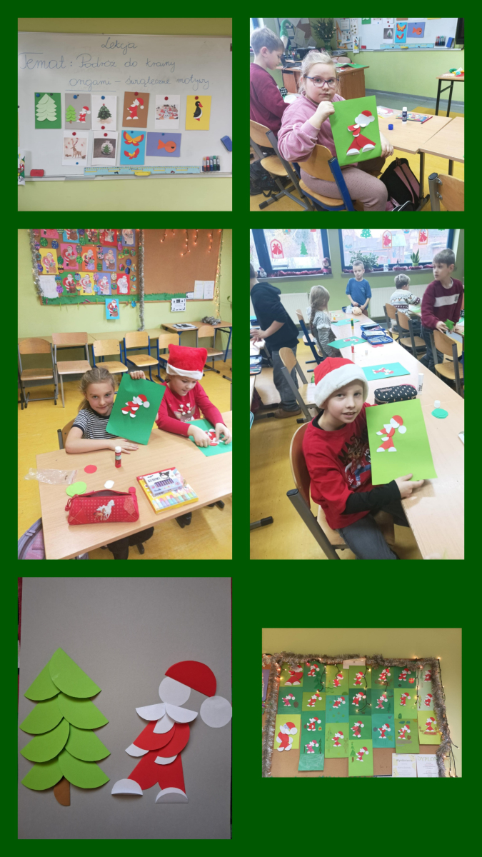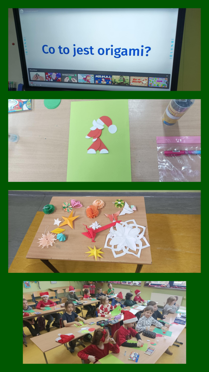 W miniony piątek uczniowie klasy IIe "przenieśli się w świat" origami. Wykazali się ogromną wiedzą na temat japońskiej sztuki składania papieru. Podczas lekcji dzieci wykonały postać ŚWIĘTEGO MIKOŁAJA, używając magicznych kółek (origami płaskie). Uczniowie z dużą cierpliwością i z zaangażowaniem tworzyli swoje mikołajkowe prace. Piątkowa lekcja, to inspiracja dla dzieci do zgłębiania fascynującego tematu origami.
