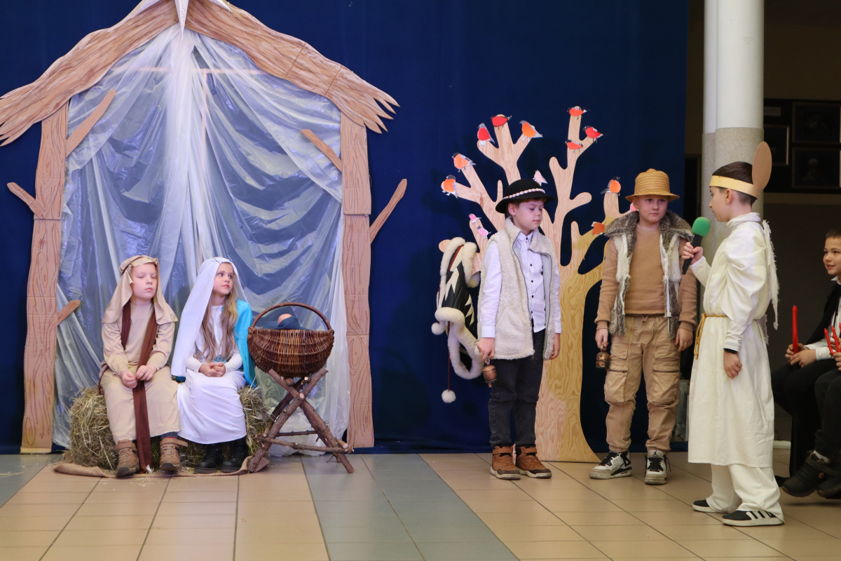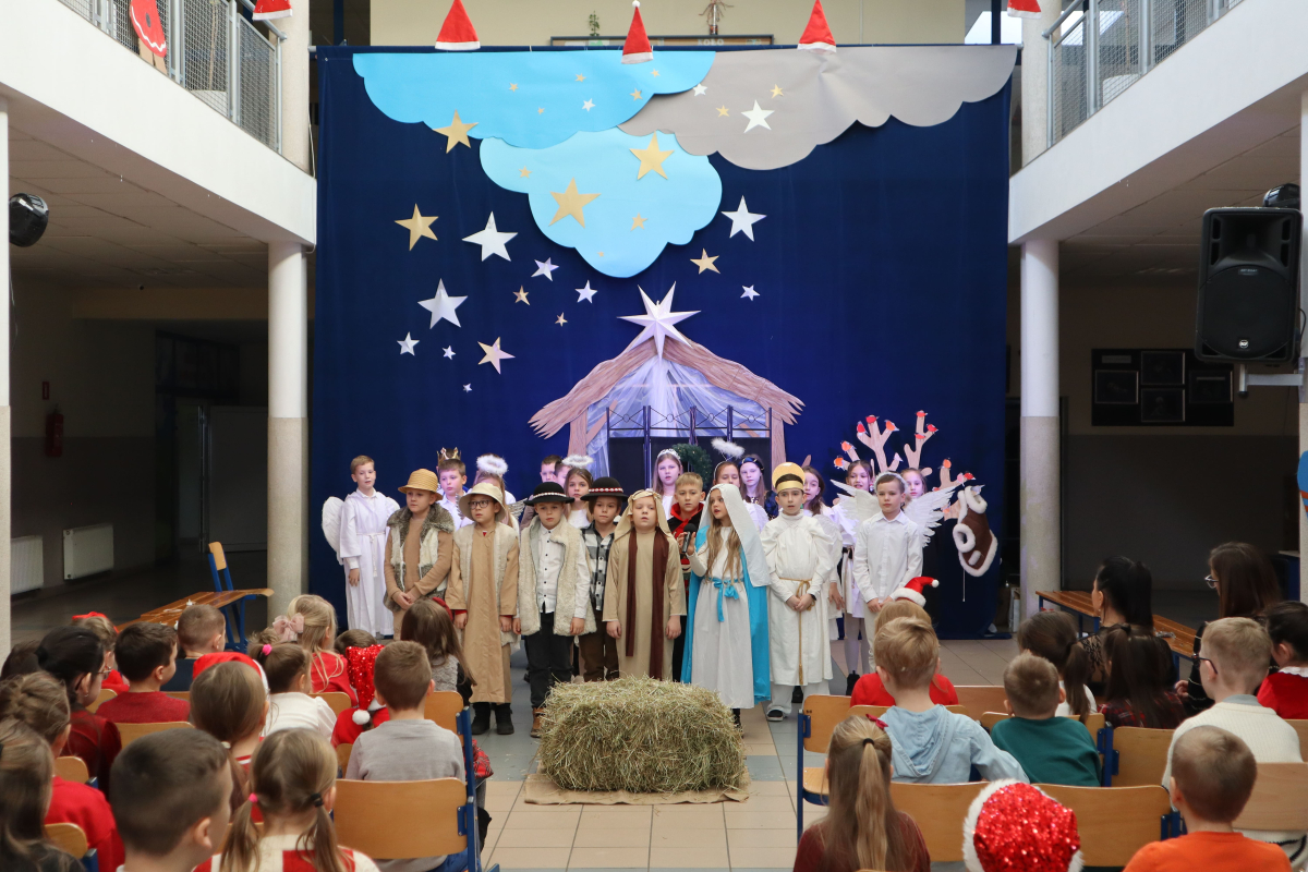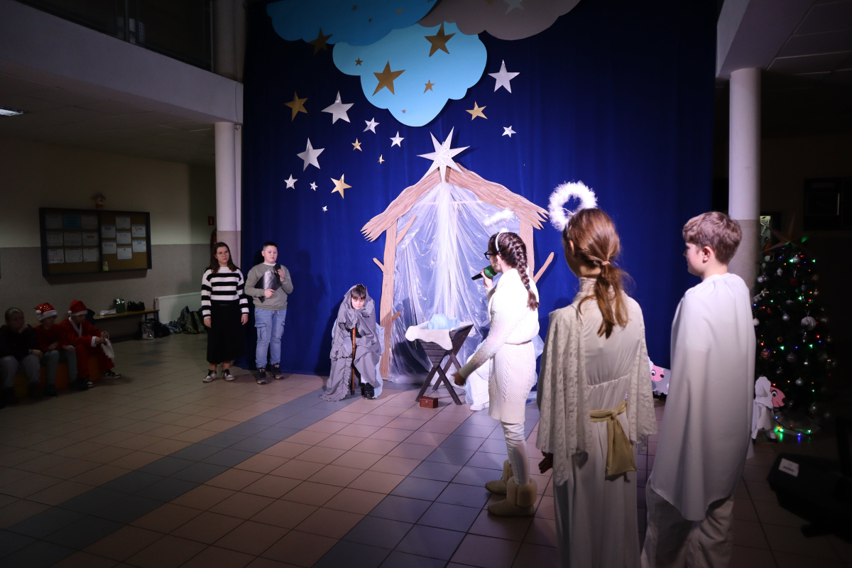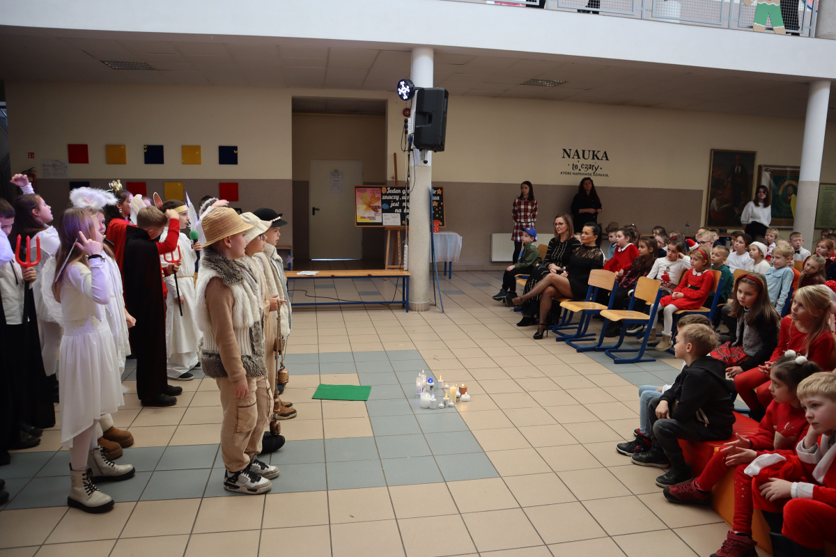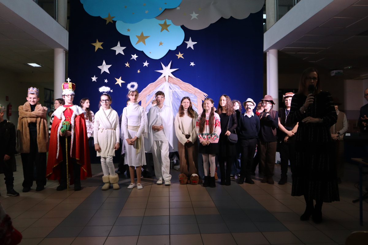 W dniu 19 grudnia 2025 r. w holu głównym, cała społeczność naszej szkoły miała przyjemność obejrzeć przedstawienie bożonarodzeniowe oraz włączyć się we wspólne śpiewanie kolęd i pastorałek. Młodzi wykonawcy przedstawili sceny związane z narodzeniem Jezusa, pokłonem pasterzy i Trzech Króli w oparciu o uczynki miłosierdzia względem duszy i ciała. Przedstawienie zostało poprzedzone delegacją zuchów, którzy przekazali naszej szkole Betlejemskie Światło Pokoju, dzieląc się radosną nowiną i składając życzenia świąteczne. Na zakończenie Pani Kinga Helińska - Szpajda podziękowała wykonawcom, ich opiekunom i złożyła wszystkim życzenia świąteczne i noworoczne.
