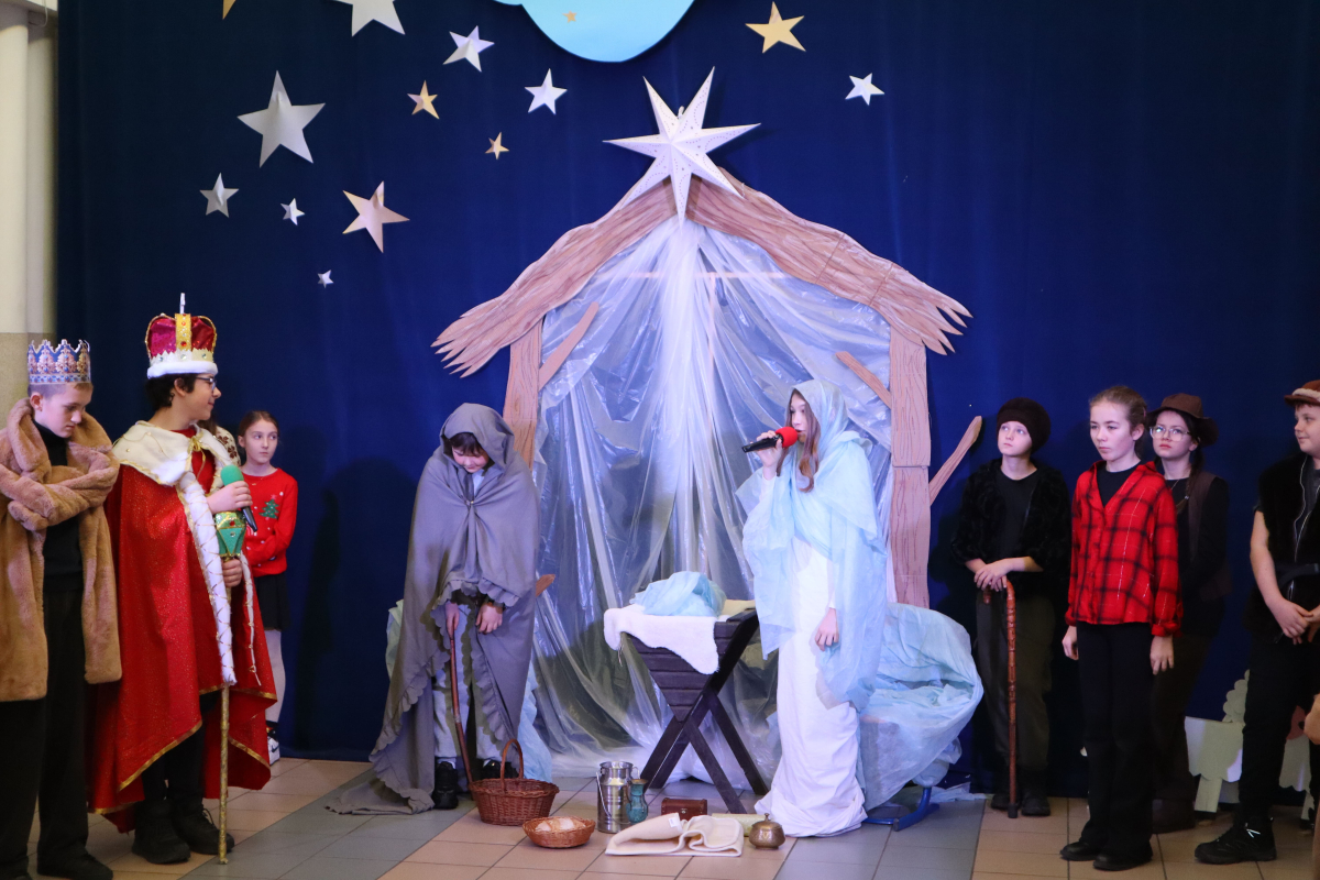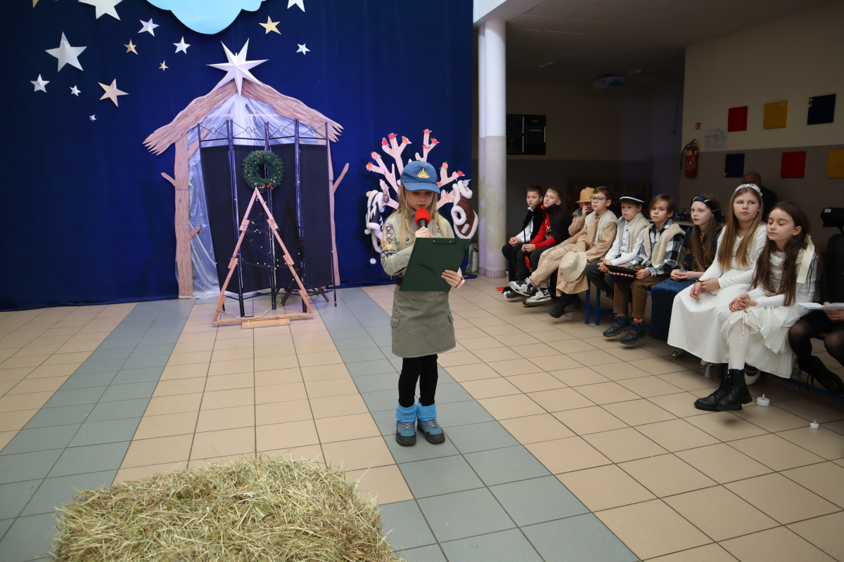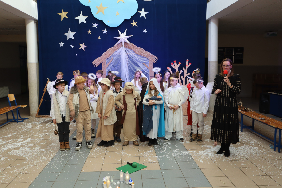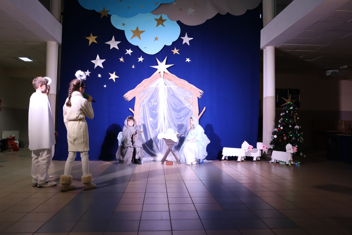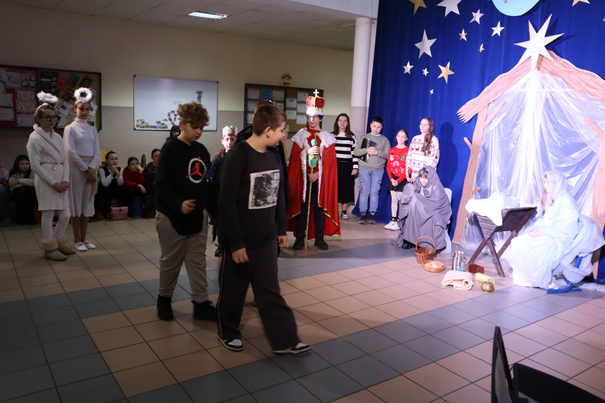 W dniu 19 grudnia 2025 r. w holu głównym, cała społeczność naszej szkoły miała przyjemność obejrzeć przedstawienie bożonarodzeniowe oraz włączyć się we wspólne śpiewanie kolęd i pastorałek. Młodzi wykonawcy przedstawili sceny związane z narodzeniem Jezusa, pokłonem pasterzy i Trzech Króli w oparciu o uczynki miłosierdzia względem duszy i ciała. Przedstawienie zostało poprzedzone delegacją zuchów, którzy przekazali naszej szkole Betlejemskie Światło Pokoju, dzieląc się radosną nowiną i składając życzenia świąteczne. Na zakończenie Pani Kinga Helińska - Szpajda podziękowała wykonawcom, ich opiekunom i złożyła wszystkim życzenia świąteczne i noworoczne.