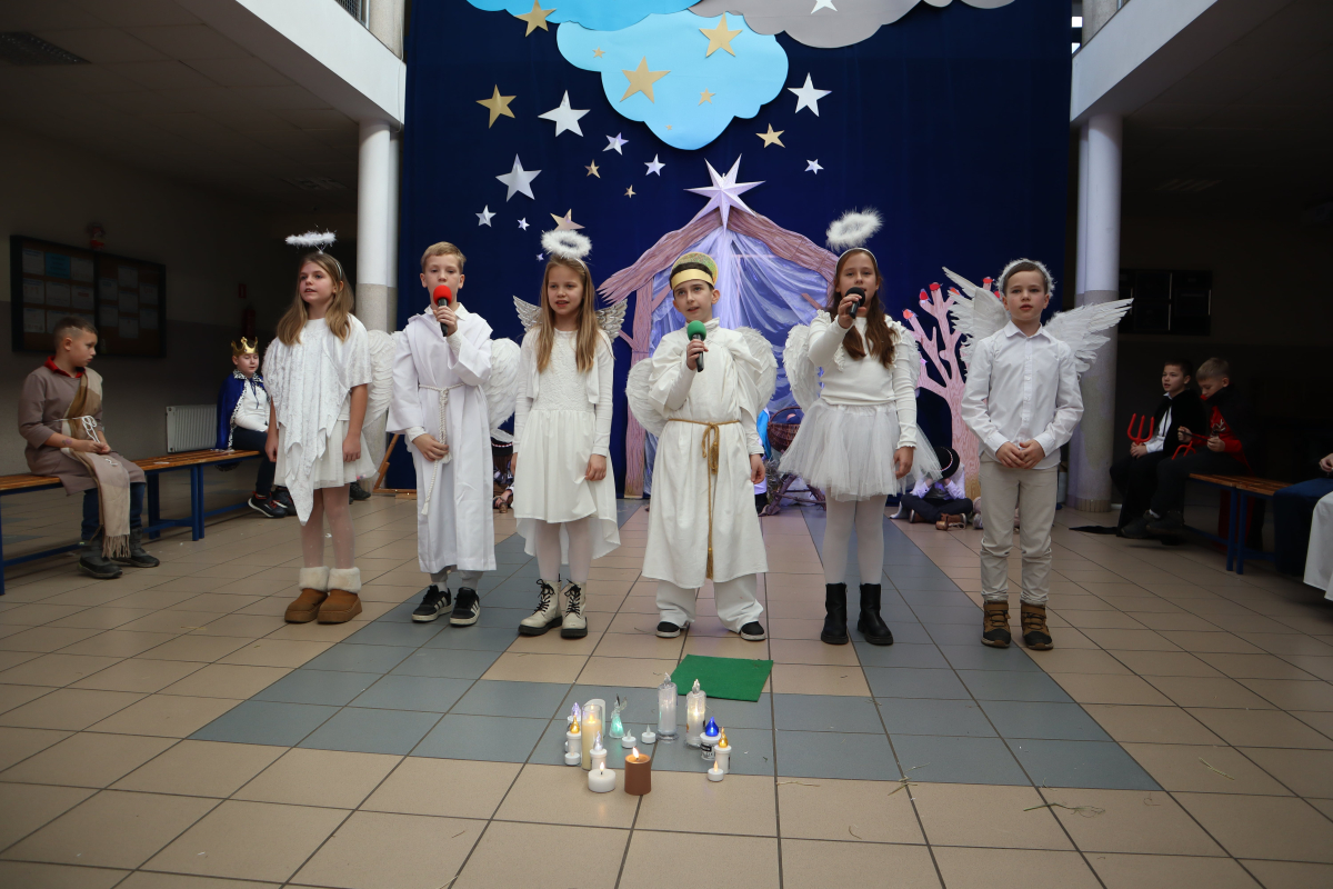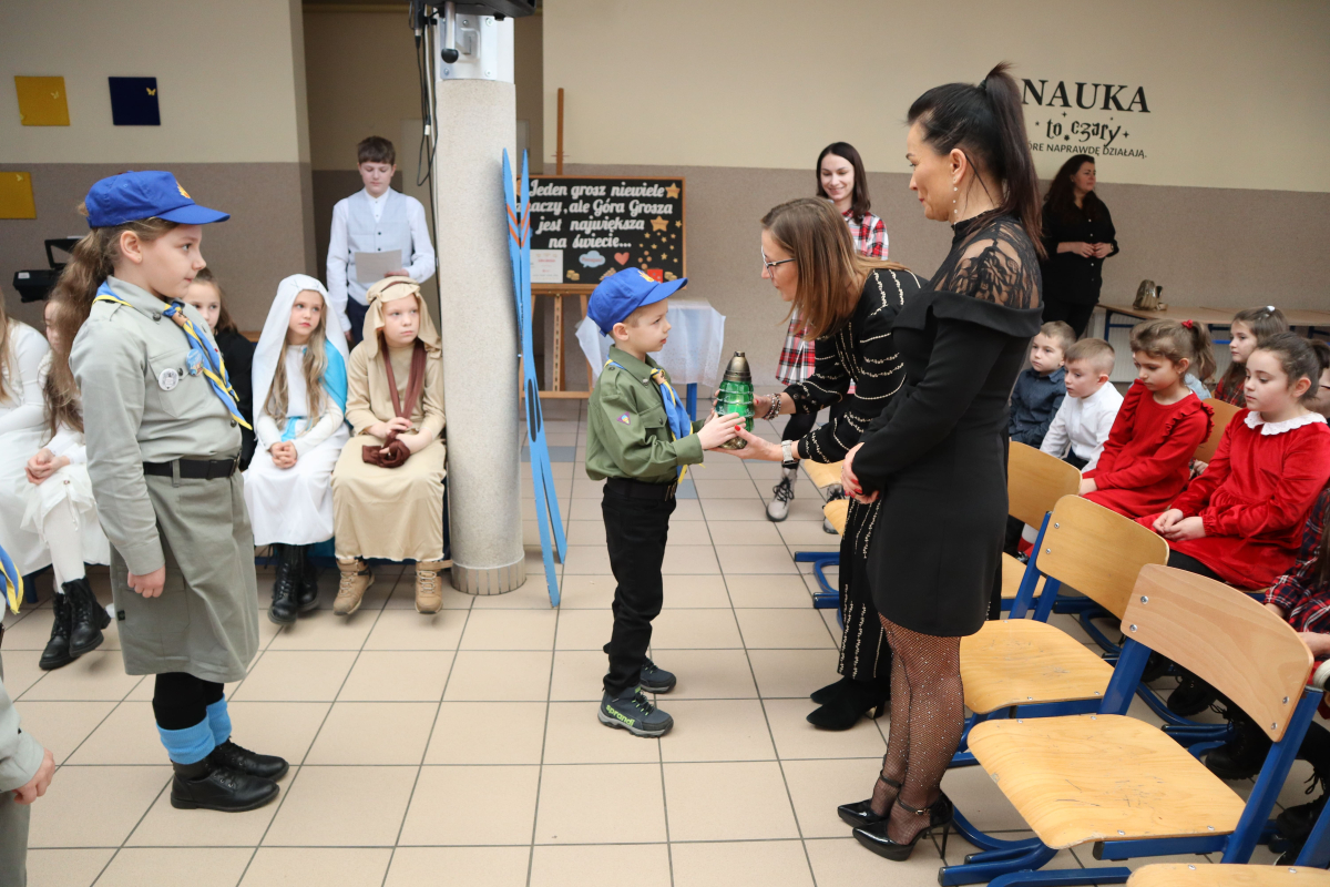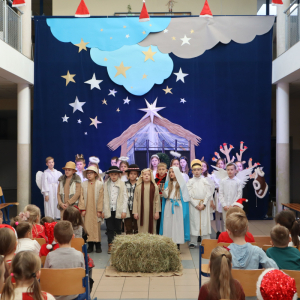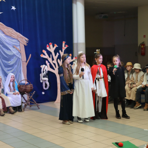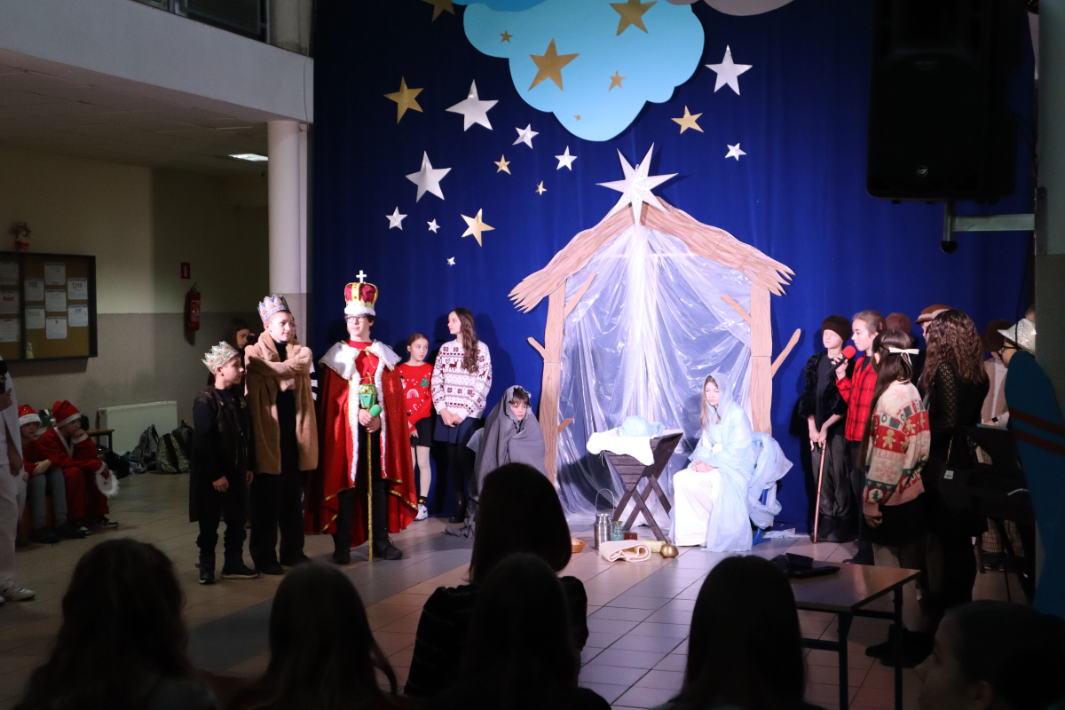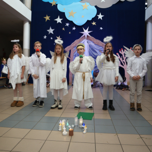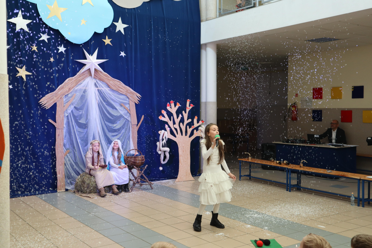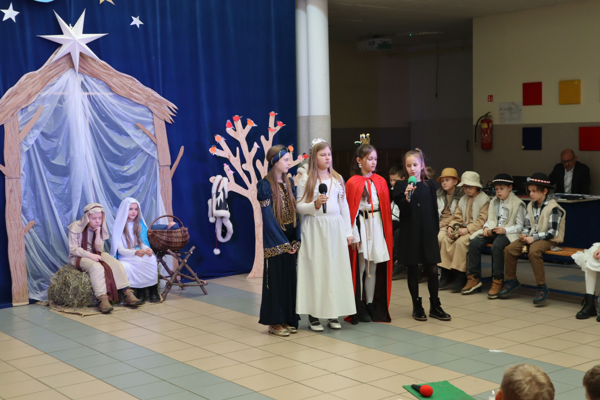W dniu 19 grudnia 2025 r. w holu głównym, cała społeczność naszej szkoły miała przyjemność obejrzeć przedstawienie bożonarodzeniowe oraz włączyć się we wspólne śpiewanie kolęd i pastorałek. Młodzi wykonawcy przedstawili sceny związane z narodzeniem Jezusa, pokłonem pasterzy i Trzech Króli w oparciu o uczynki miłosierdzia względem duszy i ciała. Przedstawienie zostało poprzedzone delegacją zuchów, którzy przekazali naszej szkole Betlejemskie Światło Pokoju, dzieląc się radosną nowiną i składając życzenia świąteczne. Na zakończenie Pani Kinga Helińska - Szpajda podziękowała wykonawcom, ich opiekunom i złożyła wszystkim życzenia świąteczne i noworoczne.