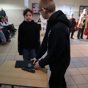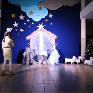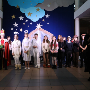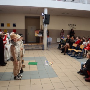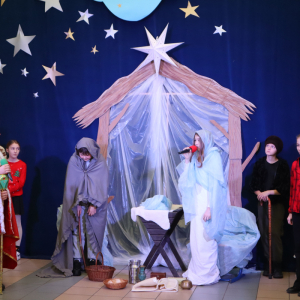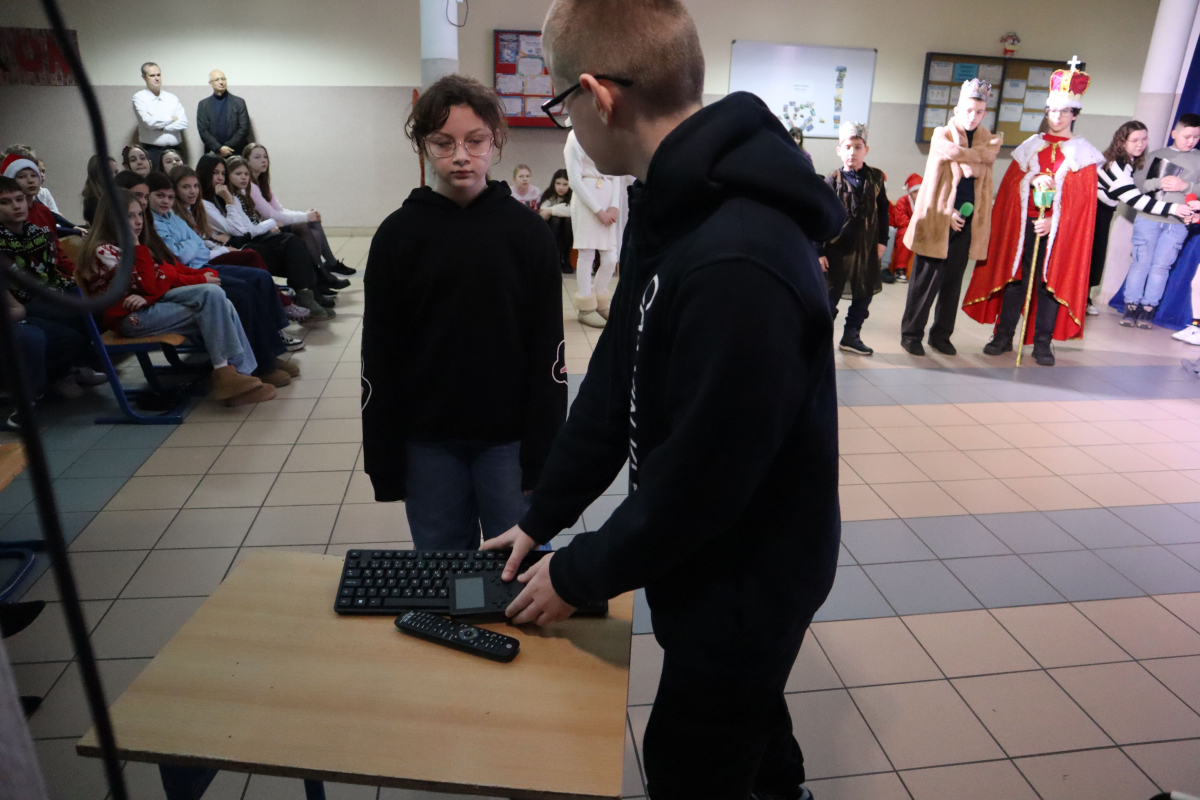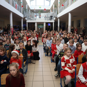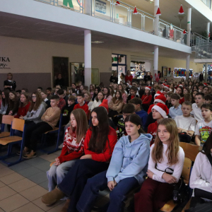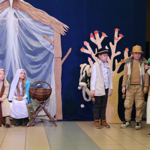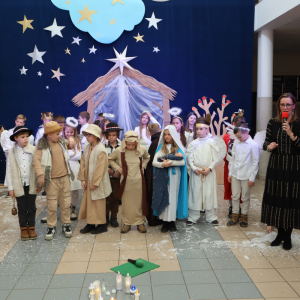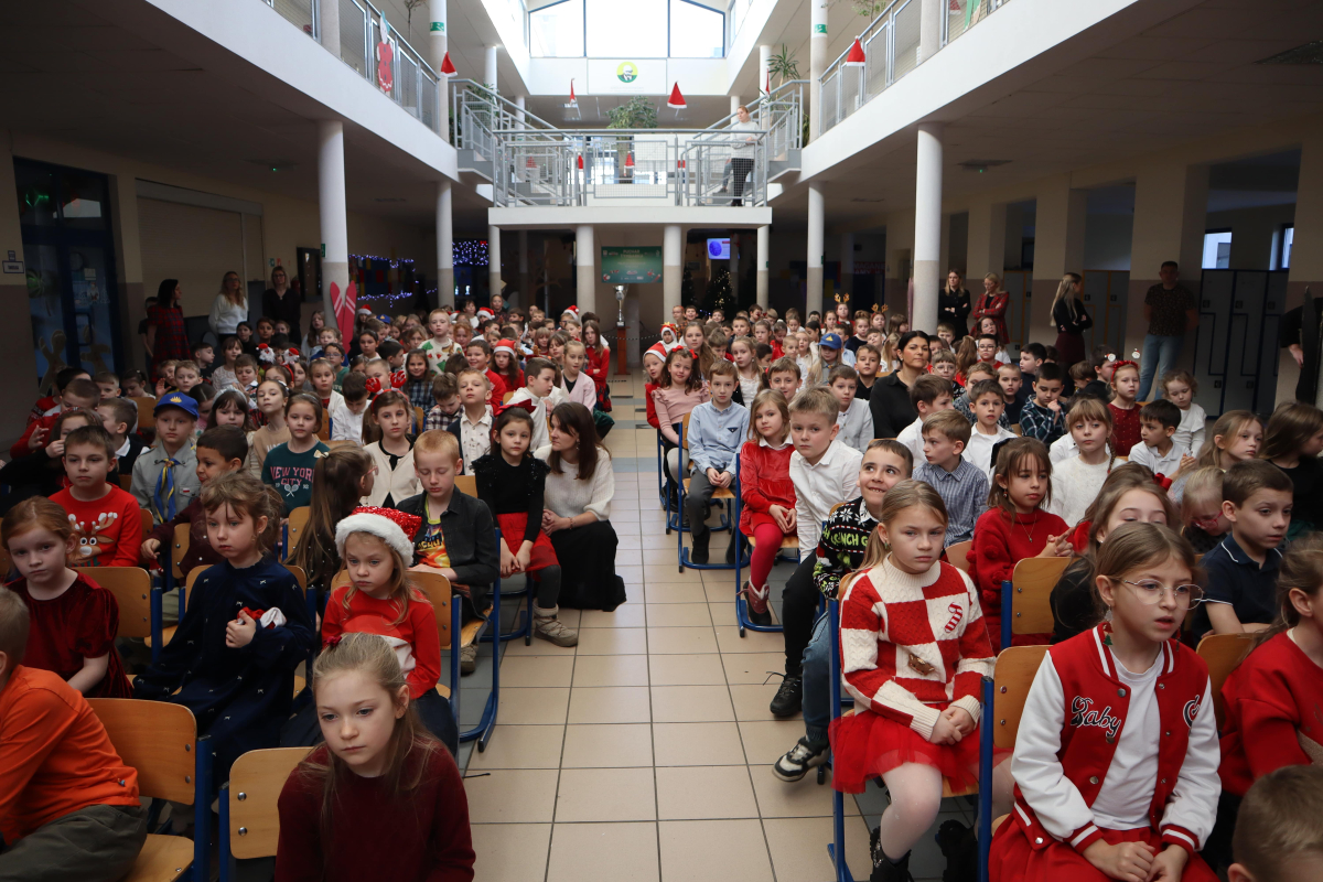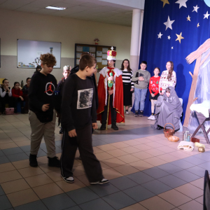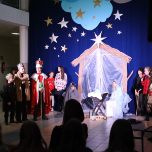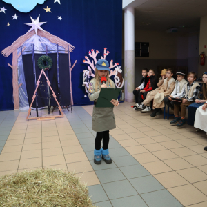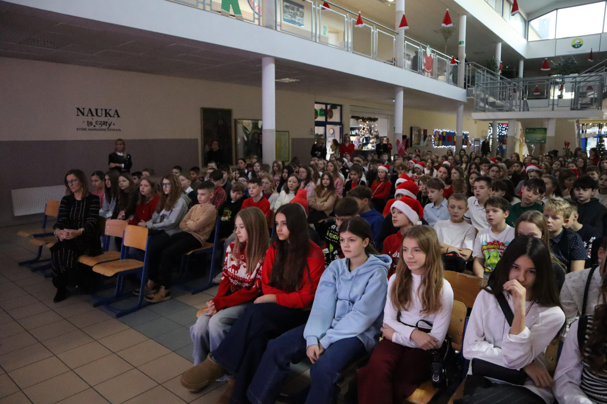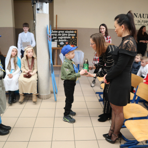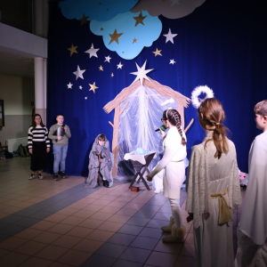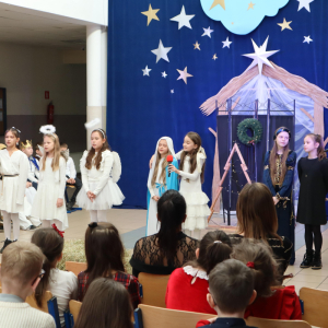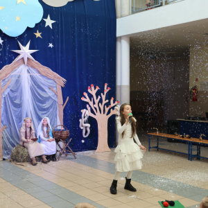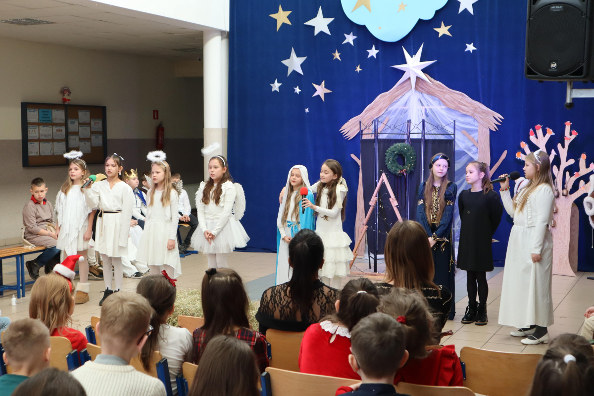 W dniu 19 grudnia 2025 r. w holu głównym, cała społeczność naszej szkoły miała przyjemność obejrzeć przedstawienie bożonarodzeniowe oraz włączyć się we wspólne śpiewanie kolęd i pastorałek. Młodzi wykonawcy przedstawili sceny związane z narodzeniem Jezusa, pokłonem pasterzy i Trzech Króli w oparciu o uczynki miłosierdzia względem duszy i ciała. Przedstawienie zostało poprzedzone delegacją zuchów, którzy przekazali naszej szkole Betlejemskie Światło Pokoju, dzieląc się radosną nowiną i składając życzenia świąteczne. Na zakończenie Pani Kinga Helińska - Szpajda podziękowała wykonawcom, ich opiekunom i złożyła wszystkim życzenia świąteczne i noworoczne.